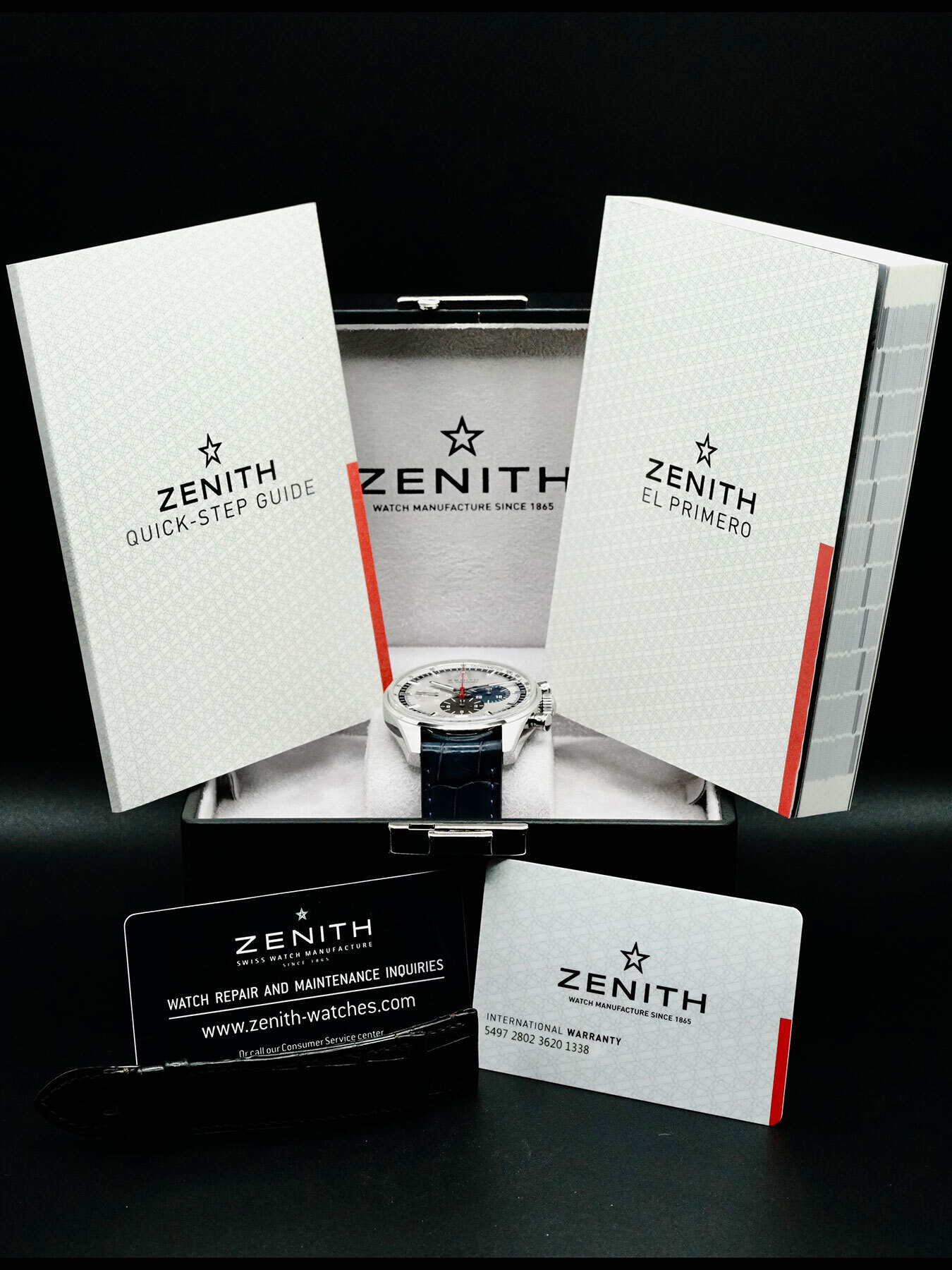 This Zenith Chronomaster El Primero 03.2040.400/69.C494 is in EXCELLENT condition. This watch includes its original box, instruction manual, and international warranty card dated for May 2018. Extra black leather strap. This watch has been fully authenticated and certified by Exquisite Timepieces.