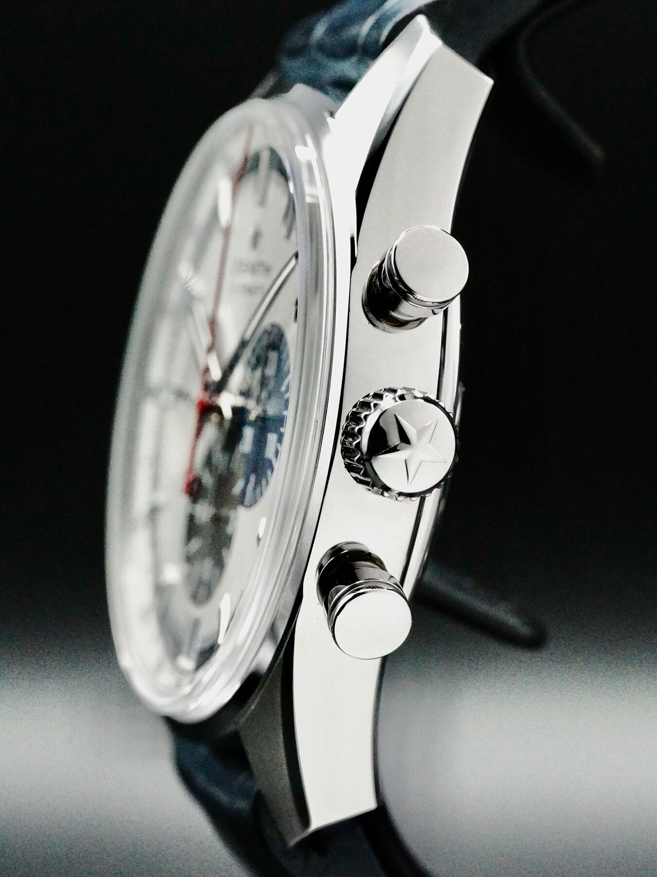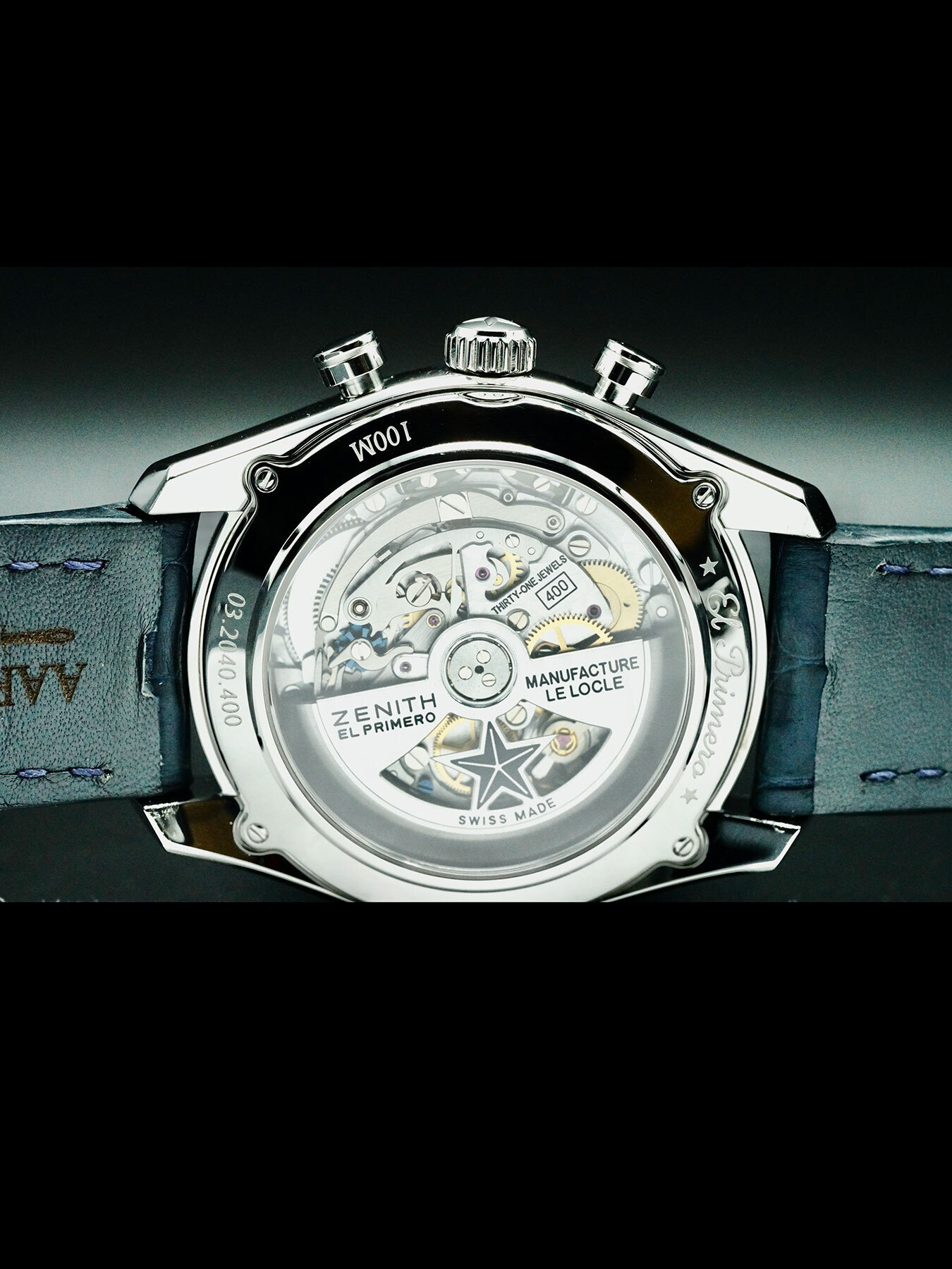 Automatic movement powered by Zenith Calibre El Primero 400B with a power reserve of approximately 50 hours. Water resistance up to 100 meters.