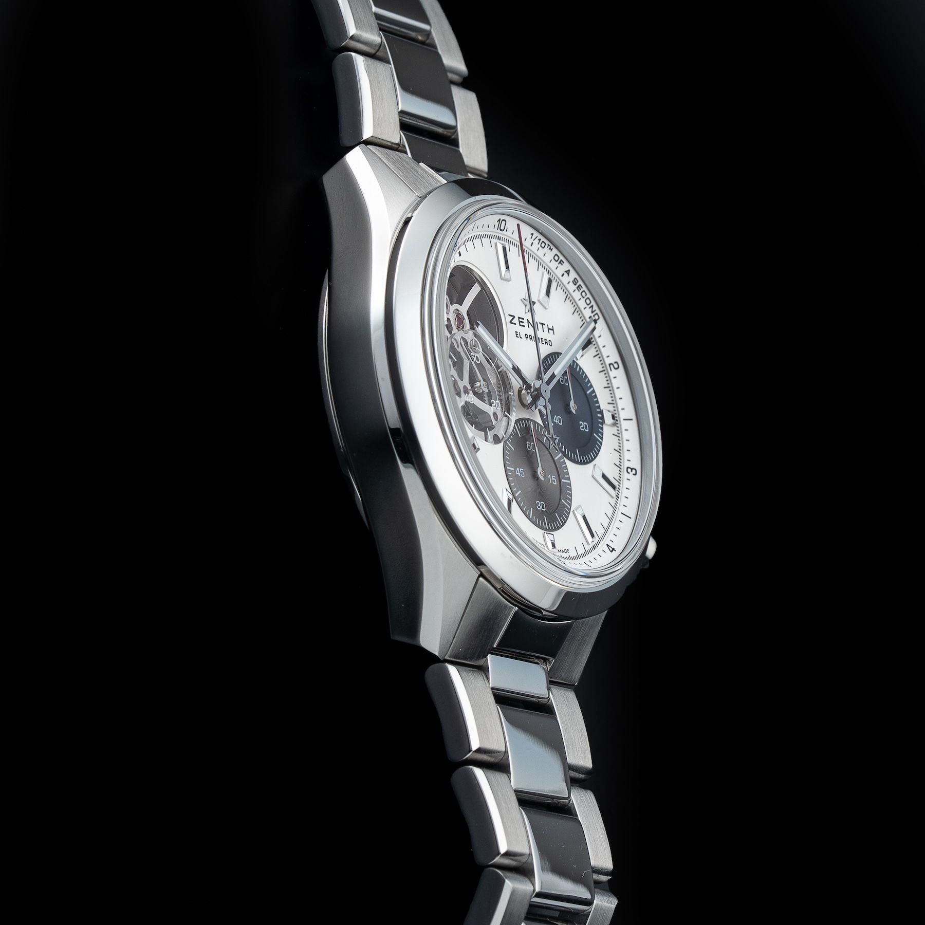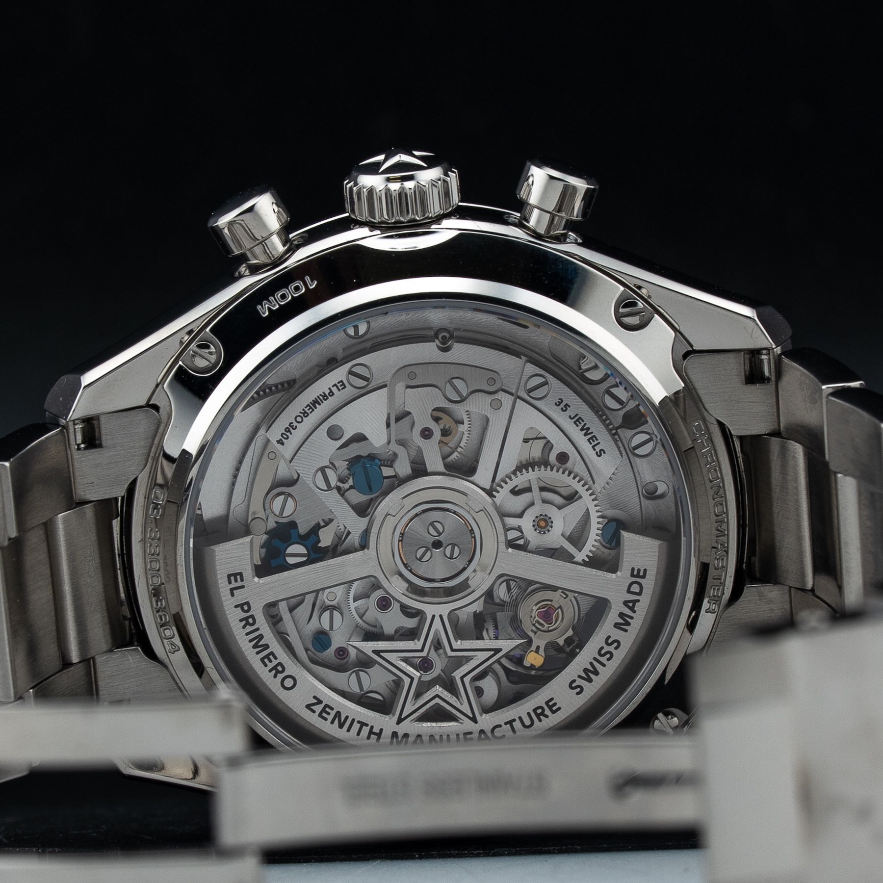 This watch features a 39.5mm stainless steel case on metal bracelet. This watch also sports a silver dial. Powered by an El primero automatic movement. Water resistance up to 100 meters.