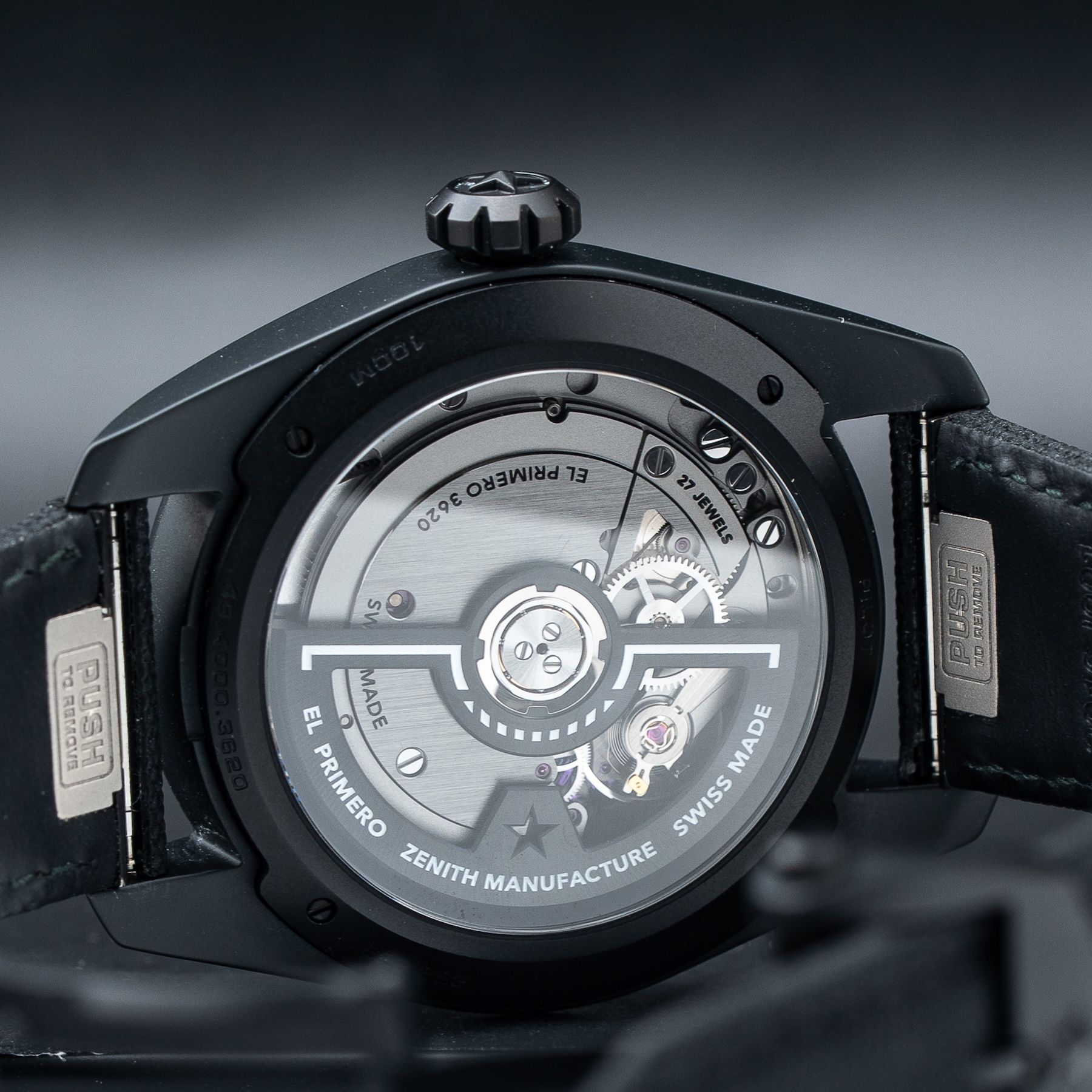 This watch features a 40mm ceramic case on rubber strap. This watch also sports a black dial. Powered by an El Primero movement. Water resistance up to 100 meters.