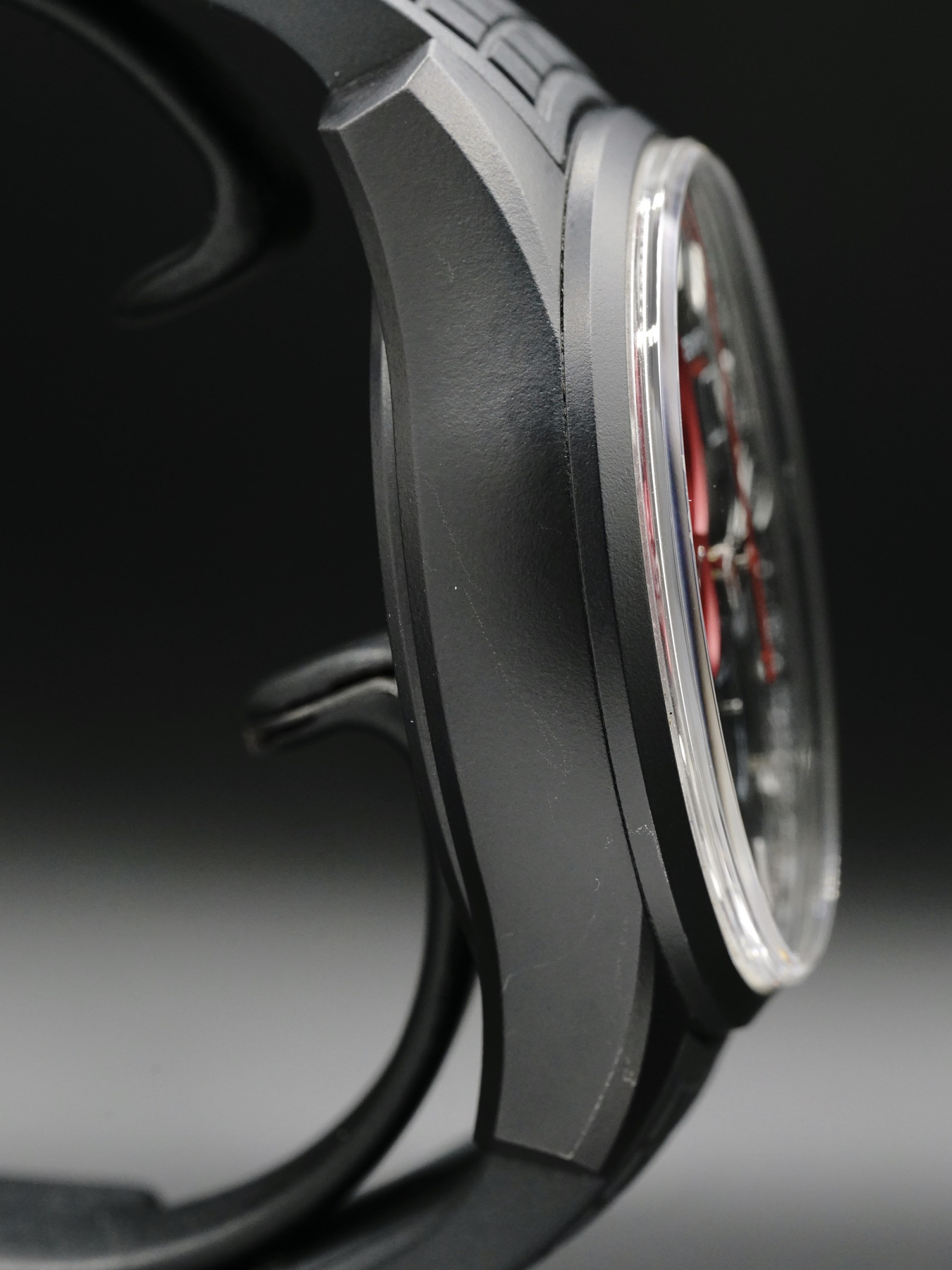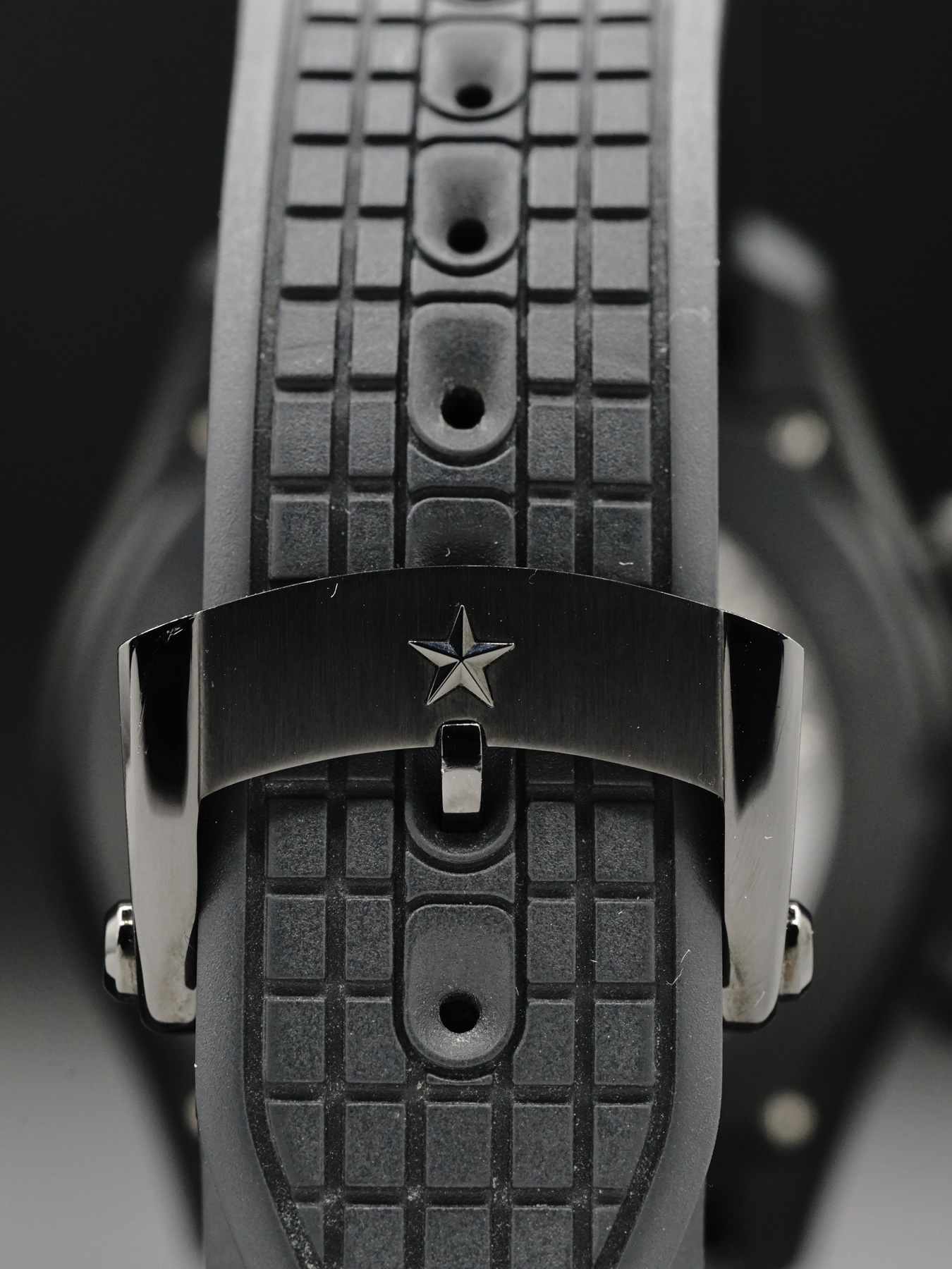 This Zenith Chronomaster Bullit Chronograph features a 45mm ceramicized aluminum case on a black rubber strap. This watch also showcases a black dial with silver-tone luminescent hands covered by anti-reflective, scratch-resistant sapphire crystal.