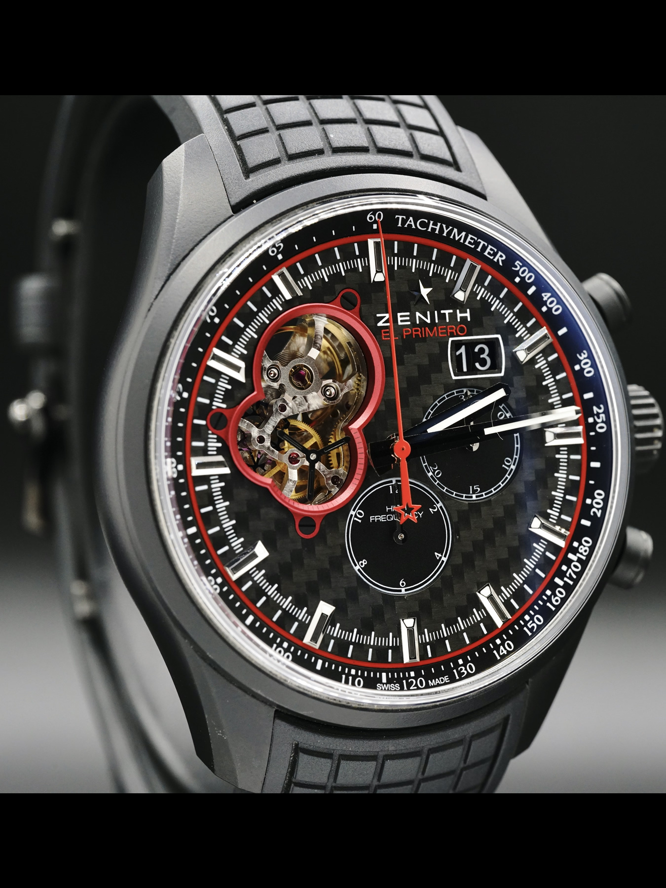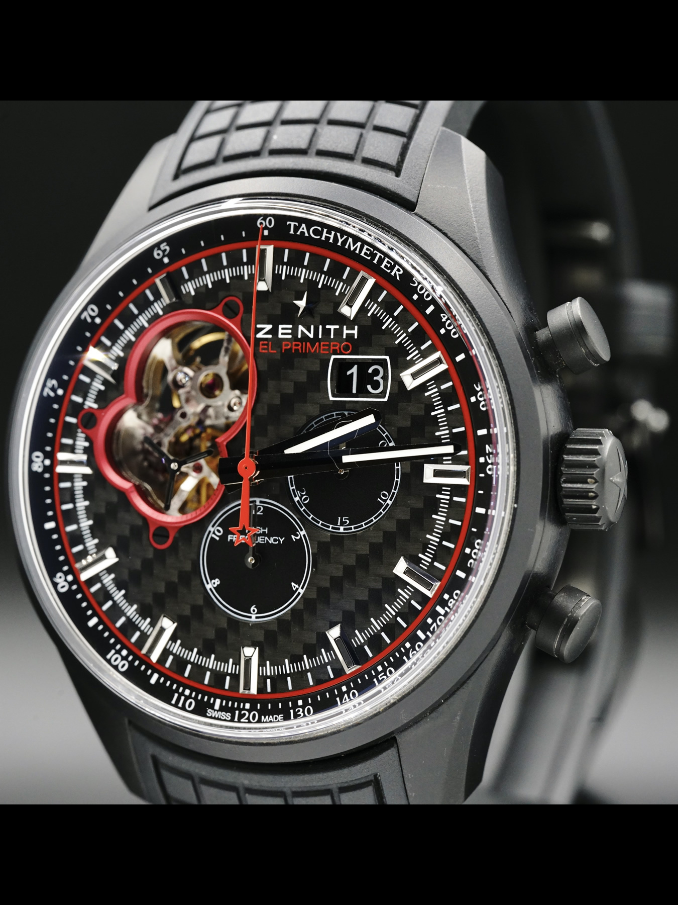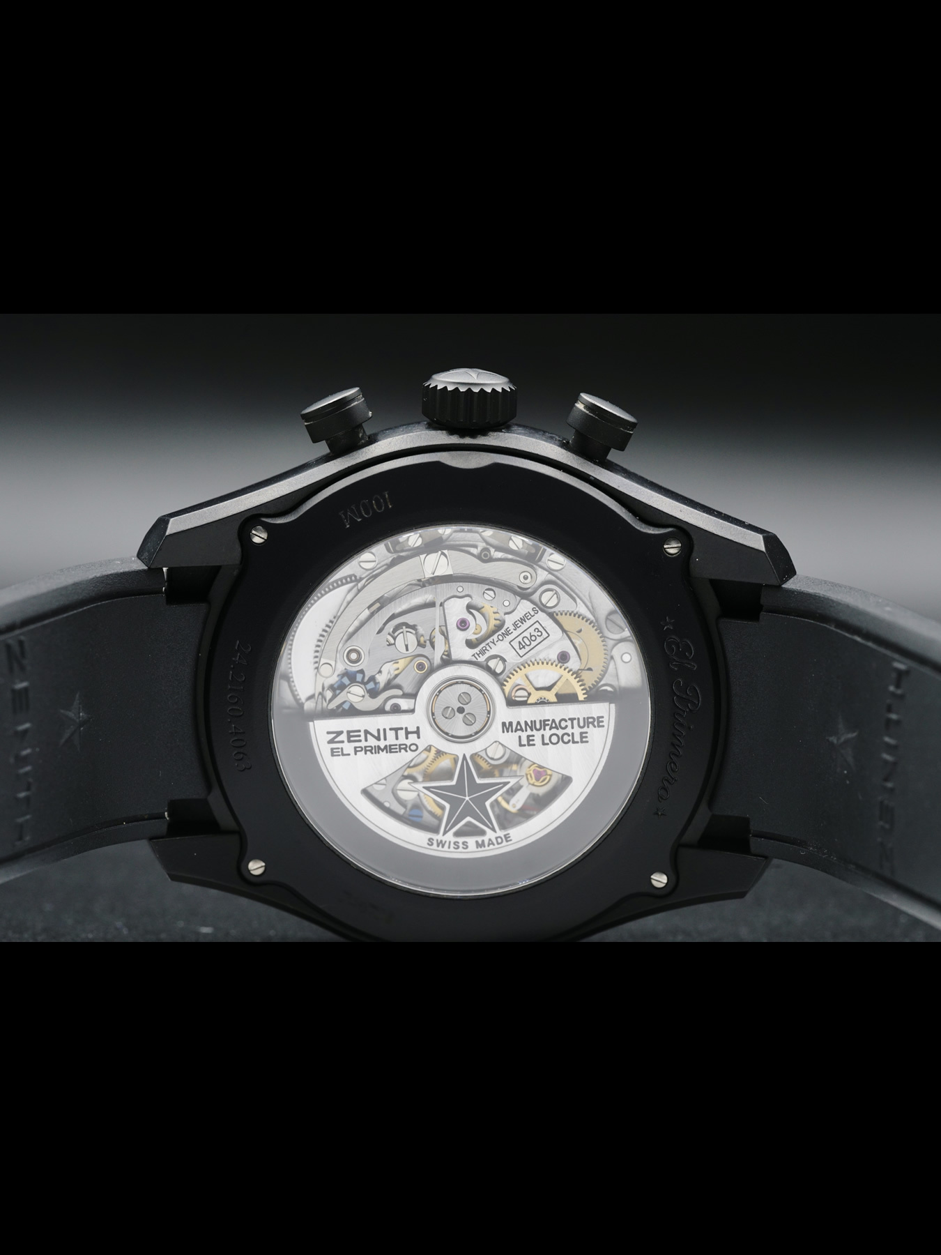 Powered by Zenith Calibre El Primero 4063 for a power reserve of approximately 50 hours. Water resistance up to 100 meters.