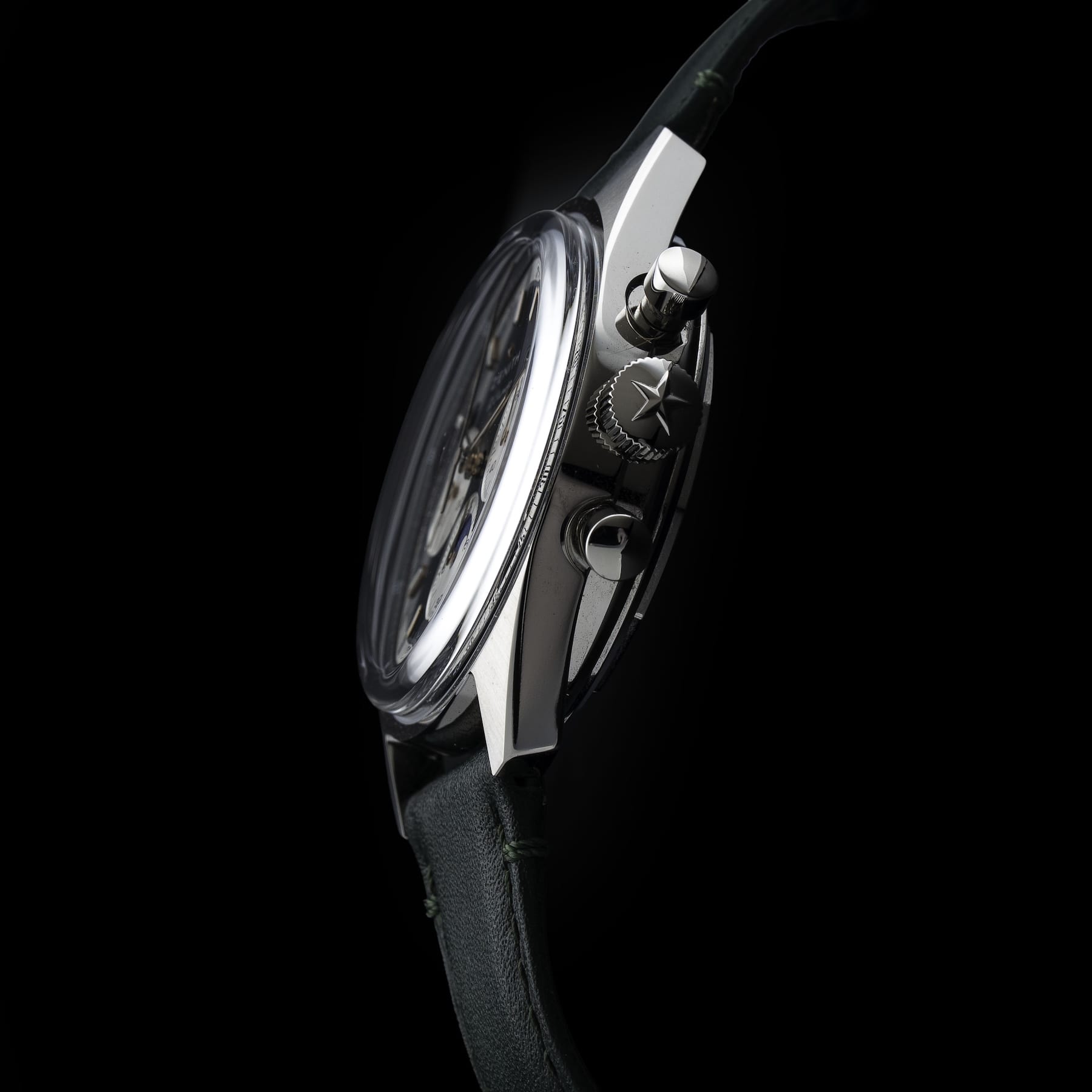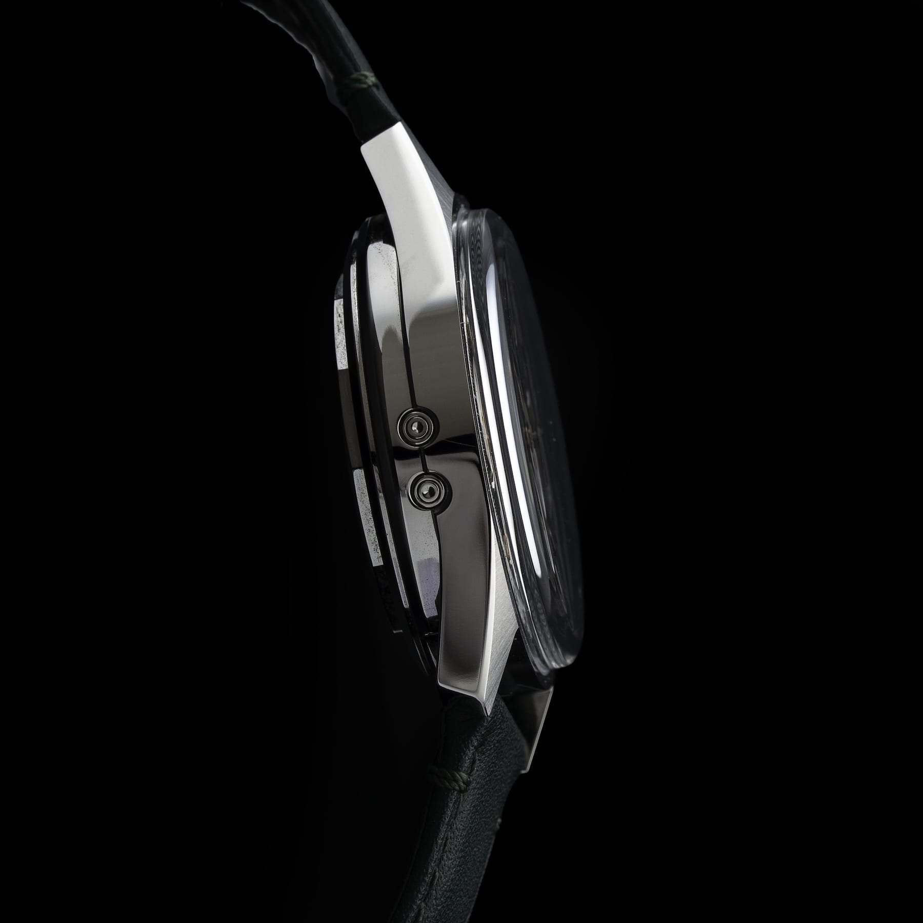 This watch features a 38mm steel case on leather strap. This watch also sports a green dial. Powered by an automatic movement. Water resistance up to 50 meters.