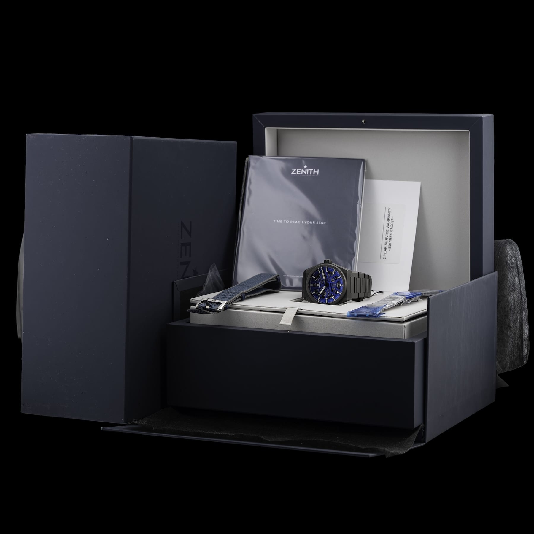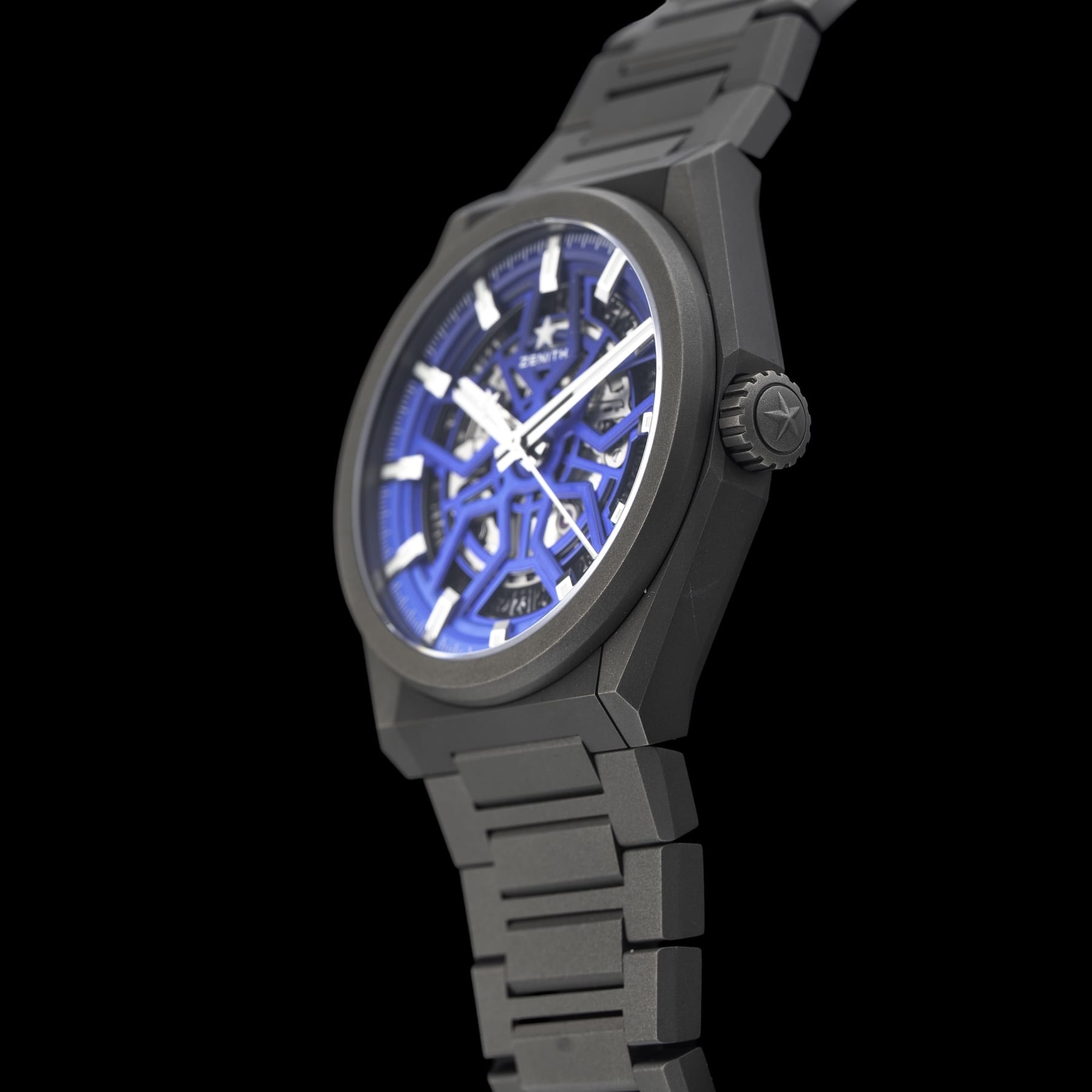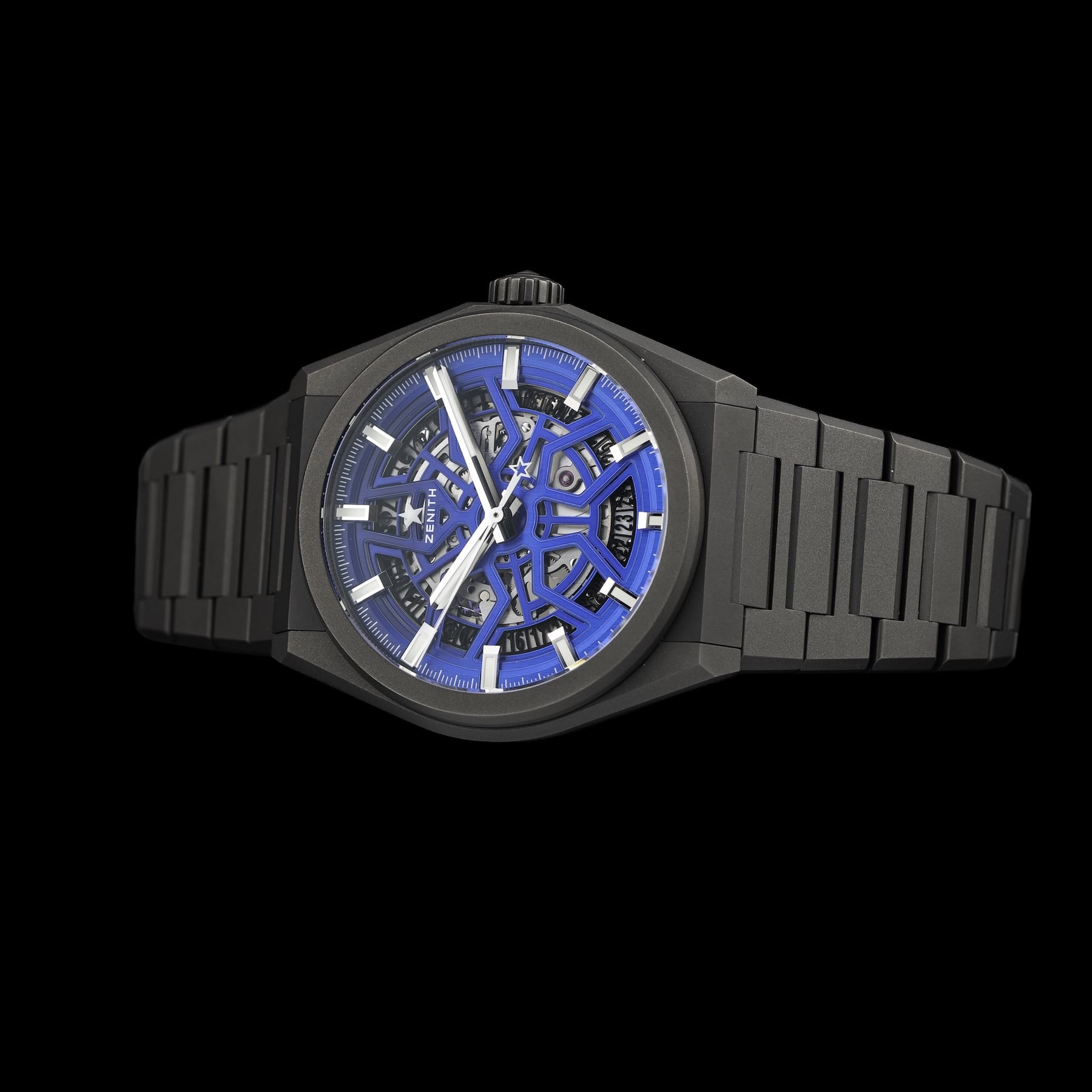 This watch features a 41mm titanium case on titanium bracelet. This watch also sports a skeletin, blue dial. Powered by an automatic movement. Water resistance up to 100 meters.