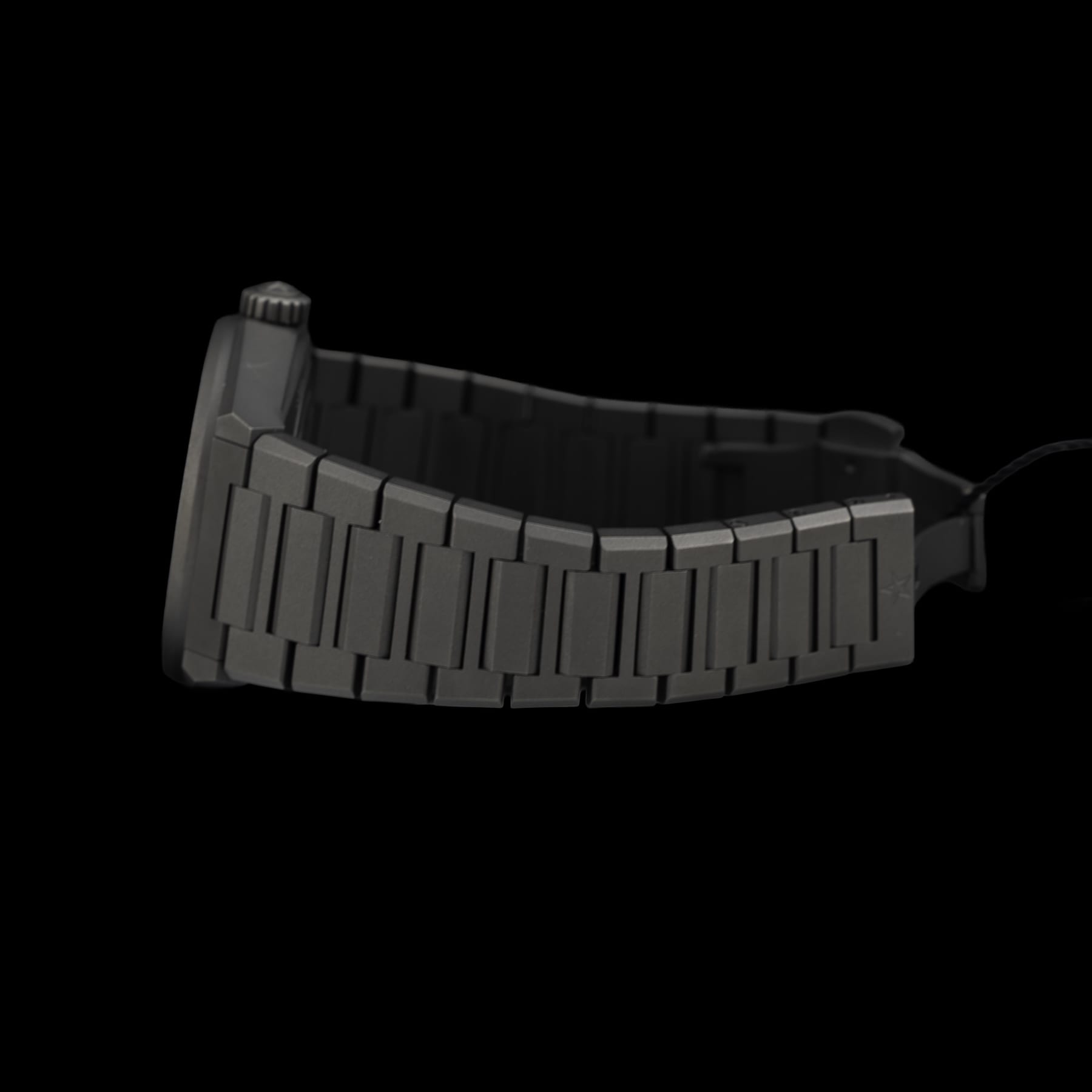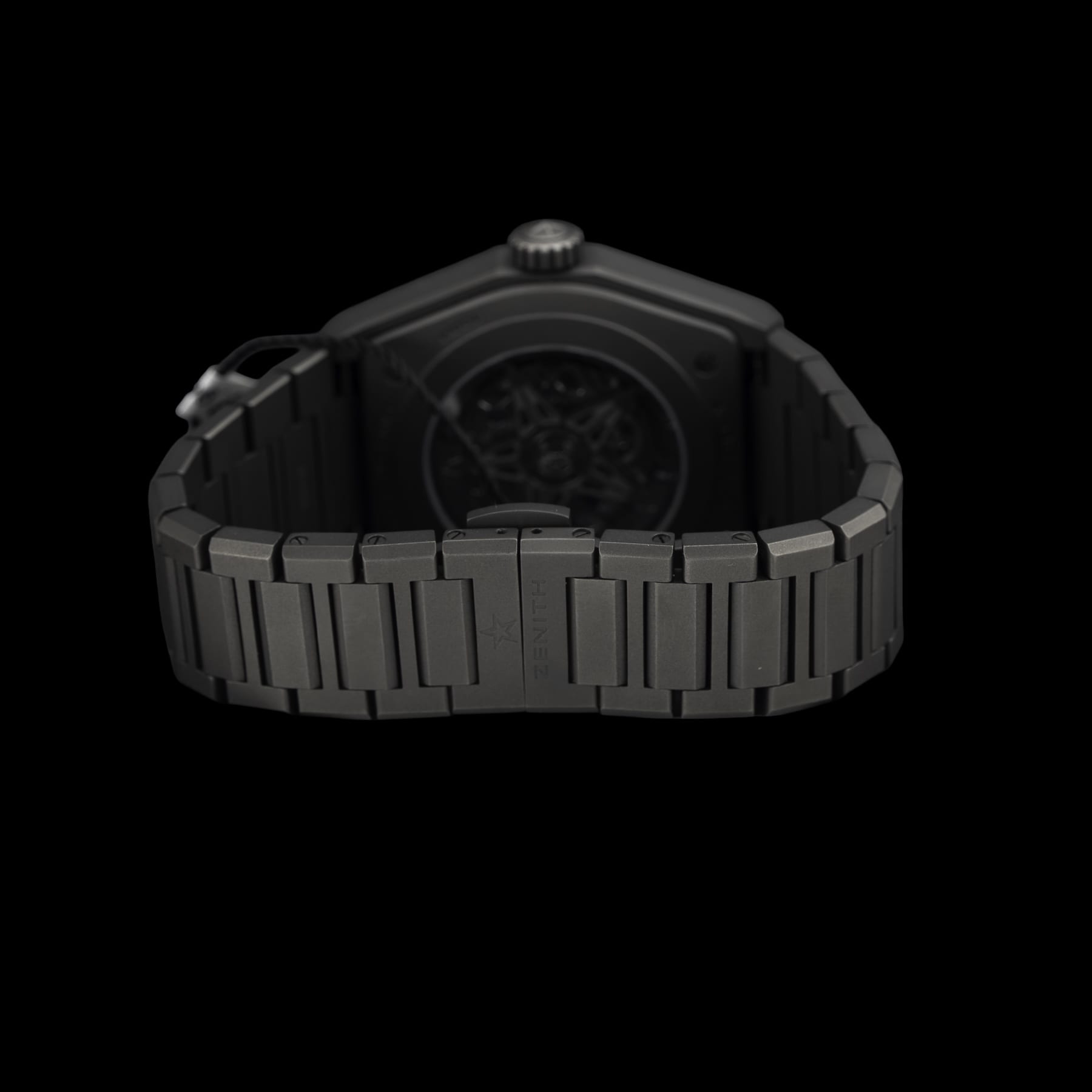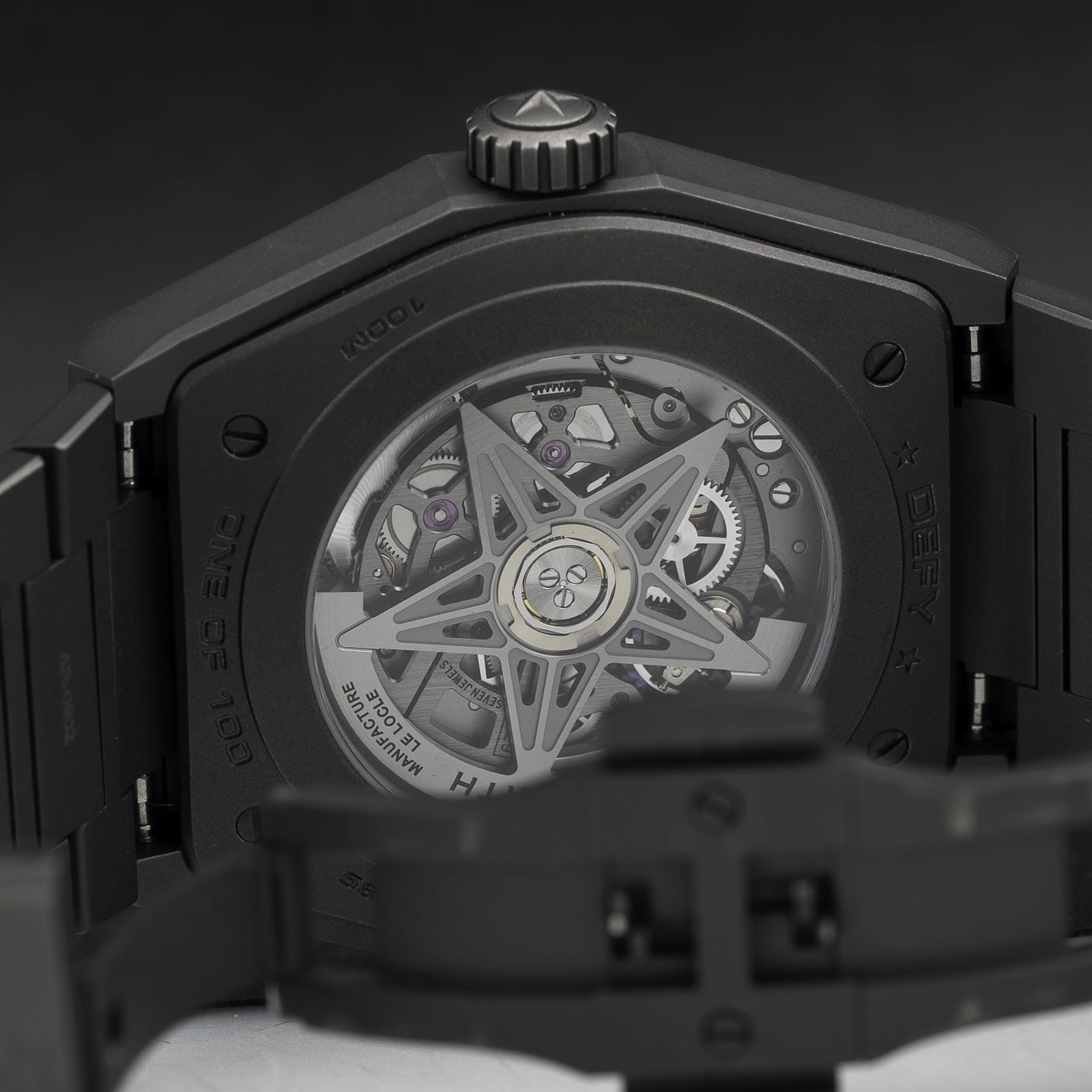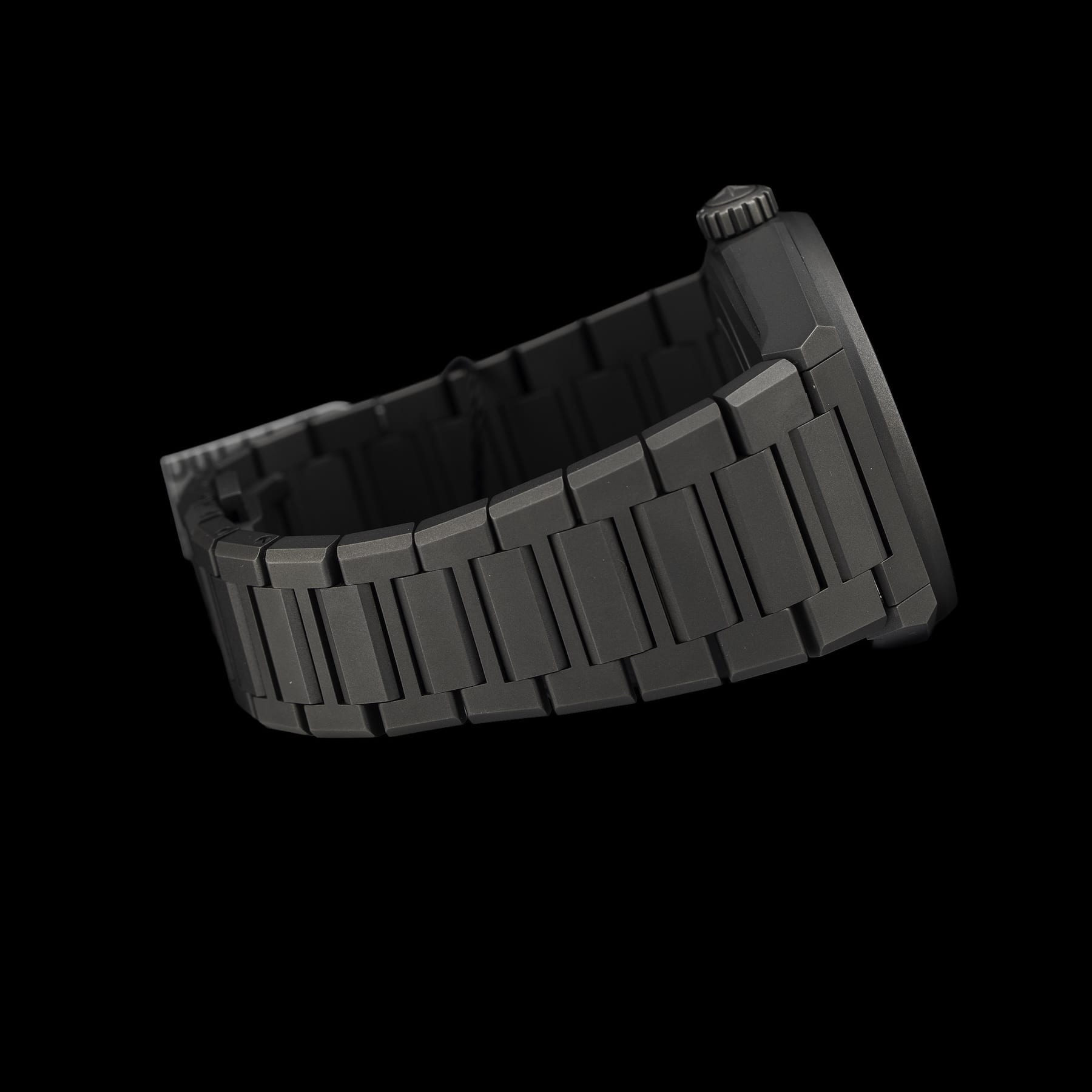 This watch features a 41mm titanium case on titanium bracelet. This watch also sports a skeletin, blue dial. Powered by an automatic movement. Water resistance up to 100 meters.