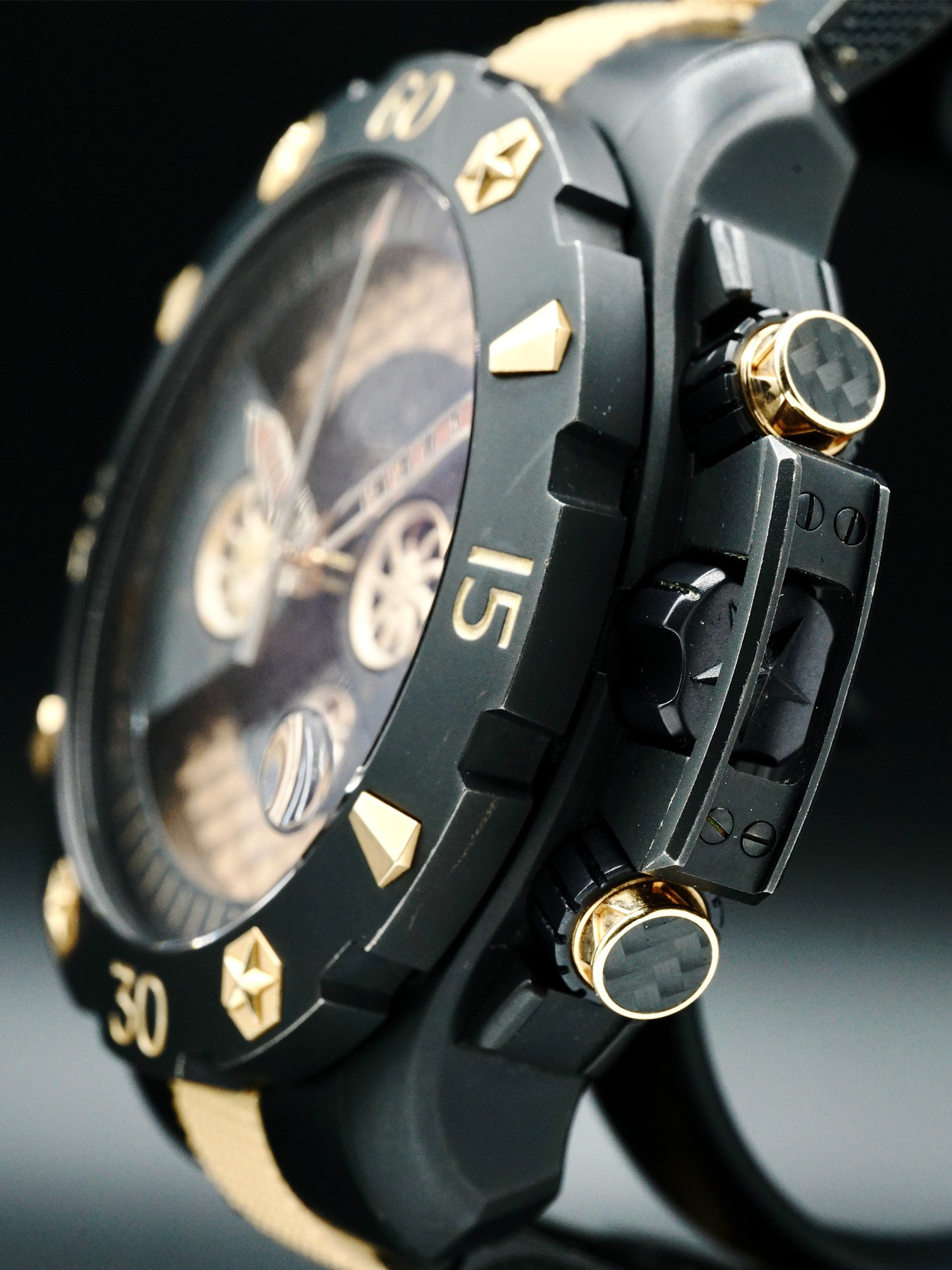 This Zenith Defy Xtreme Gold & Steel features a 47mm 18k rose gold & steel case with a solid case back on an 18k rose gold & steel bracelet. This watch also sports a black dial with gold hands and index dial markers covered by scratch resistant sapphire crystal.