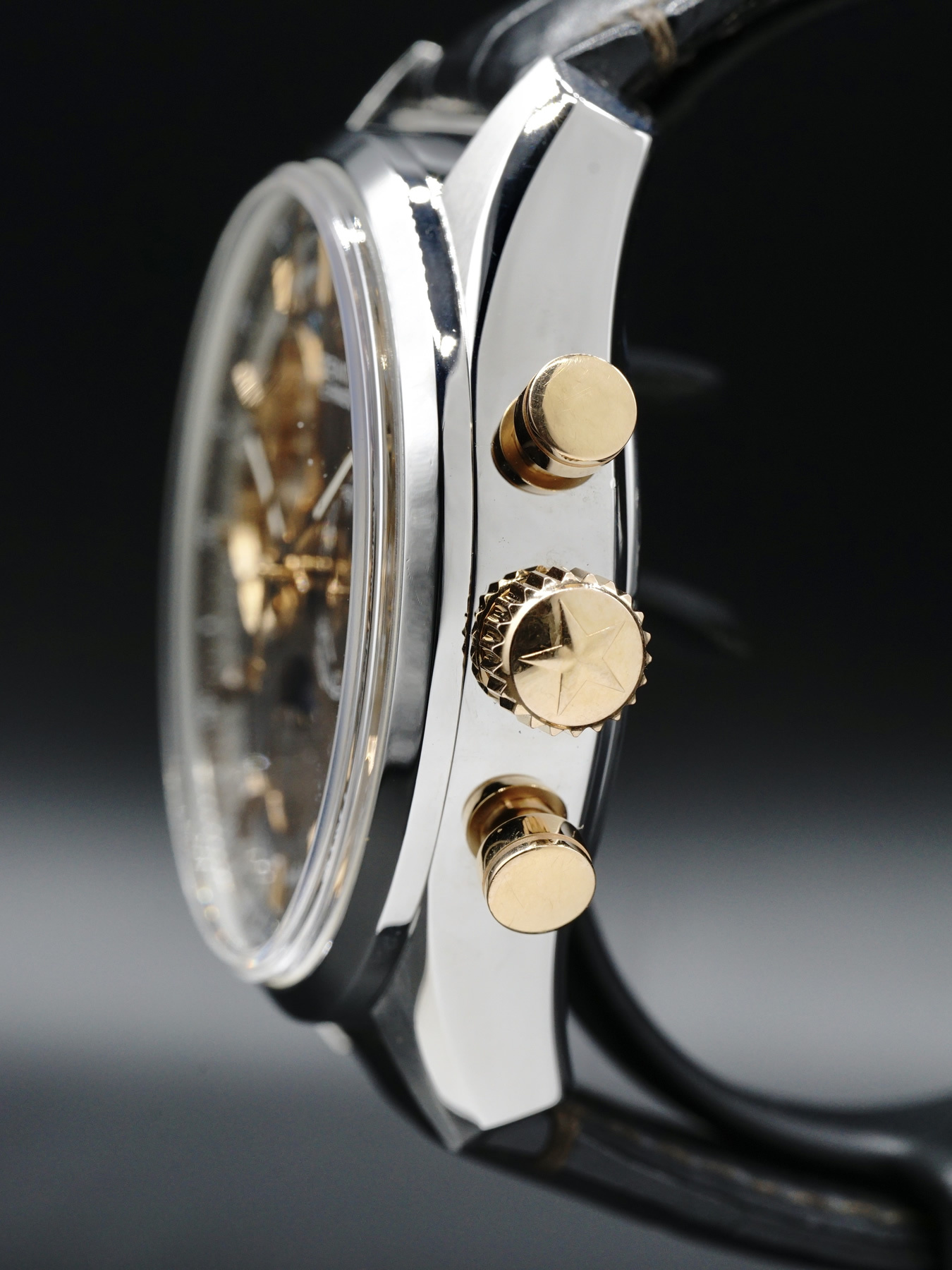 This Zenith El Primero Chronomaster features a 45mm stainless steel case with a skeleton case back and 18k rose gold crown & pushers all on a brown leather strap. This watch also sports a very unique brown cut-out dial that exposes the heart of the movement with rose gold-tone hands covered by scratch resistant sapphire crystal.