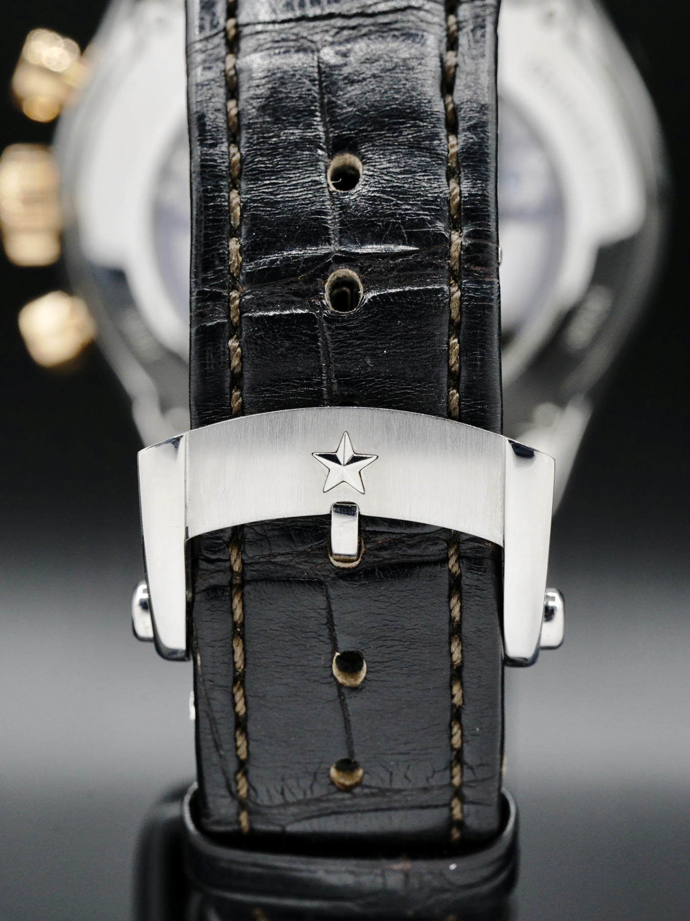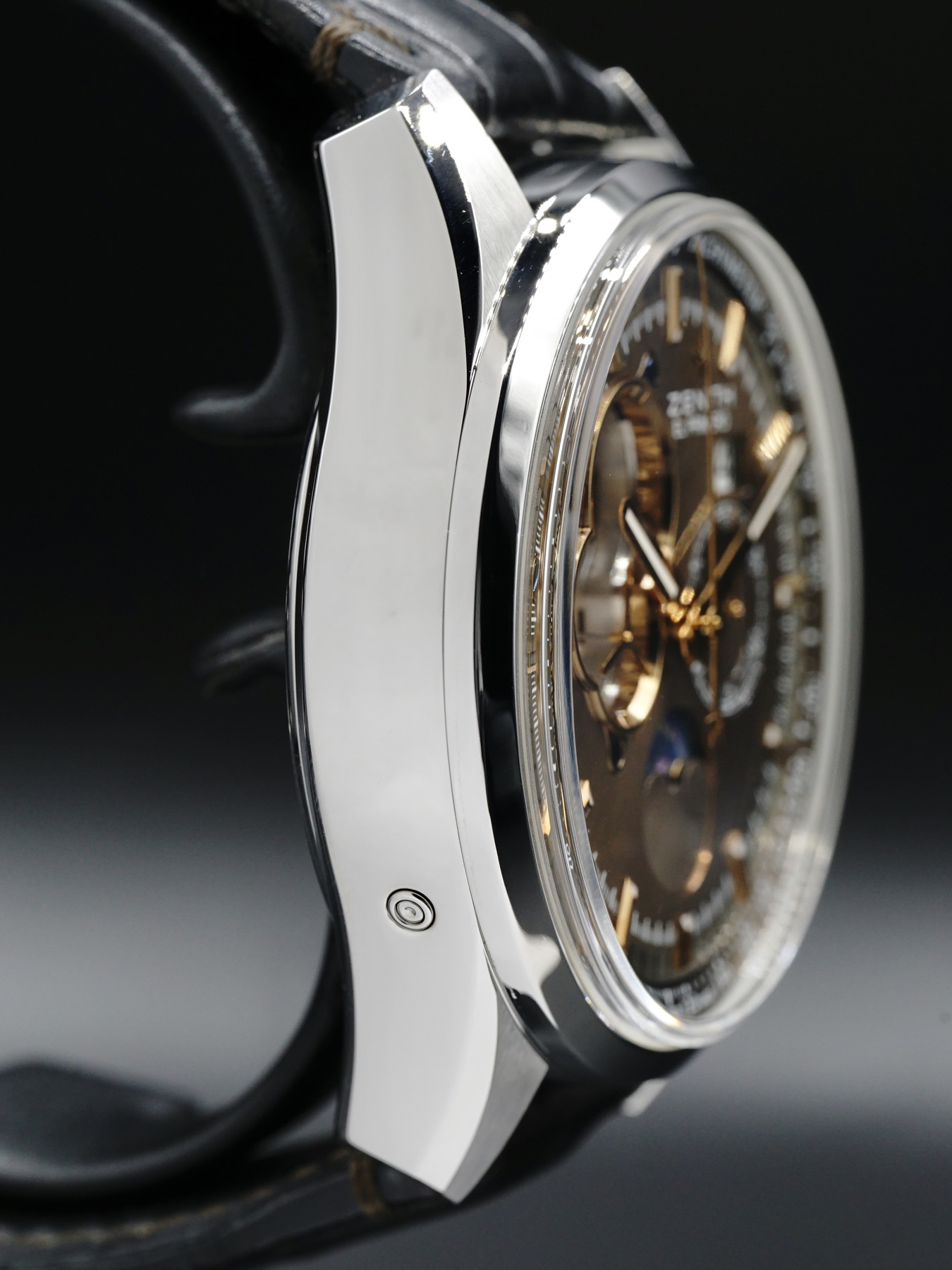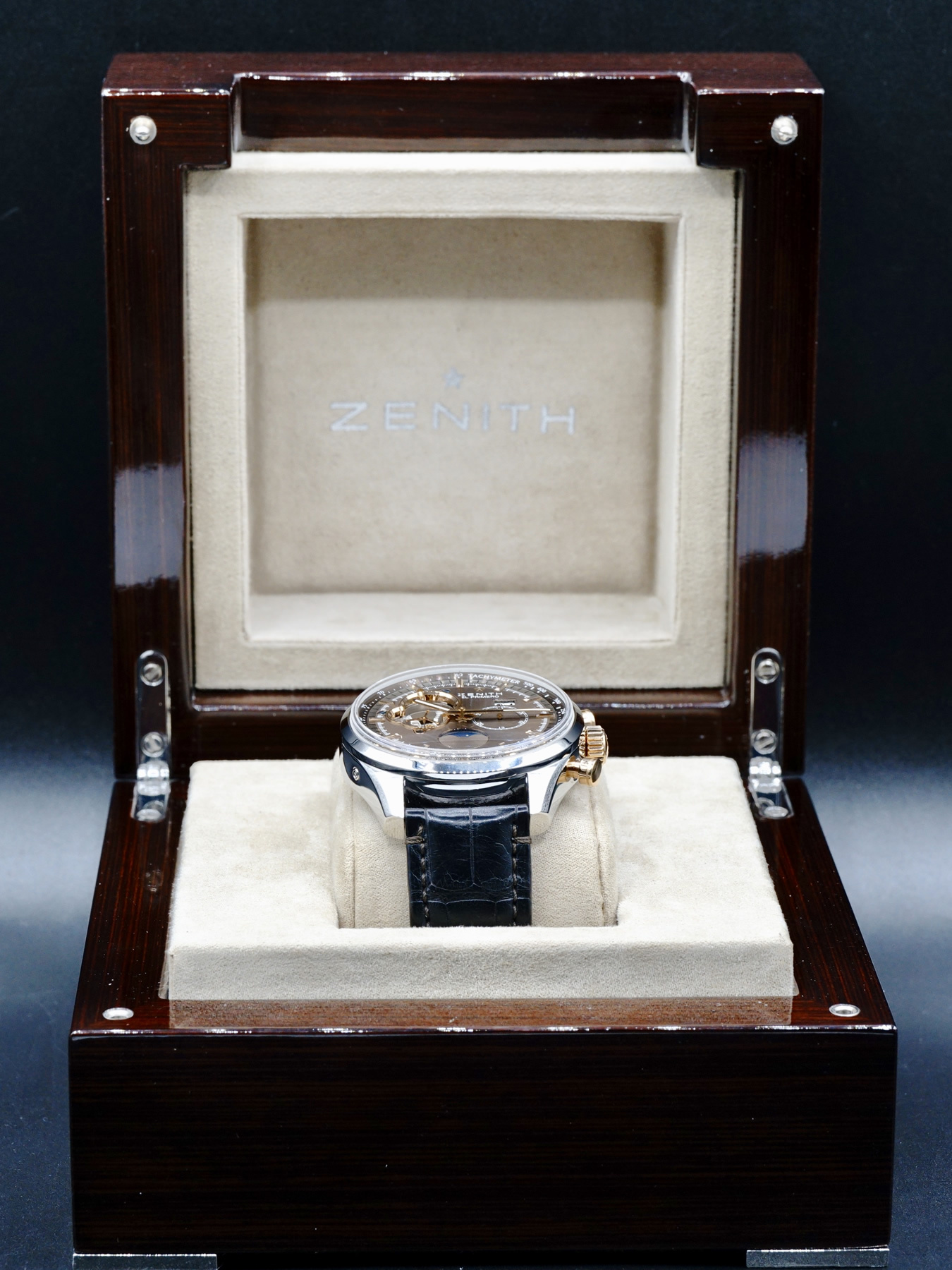 Powered by Zenith Calibre El Primero 4047 for a power reserve of approximately 50 hours. Water resistance up to 50 meters.