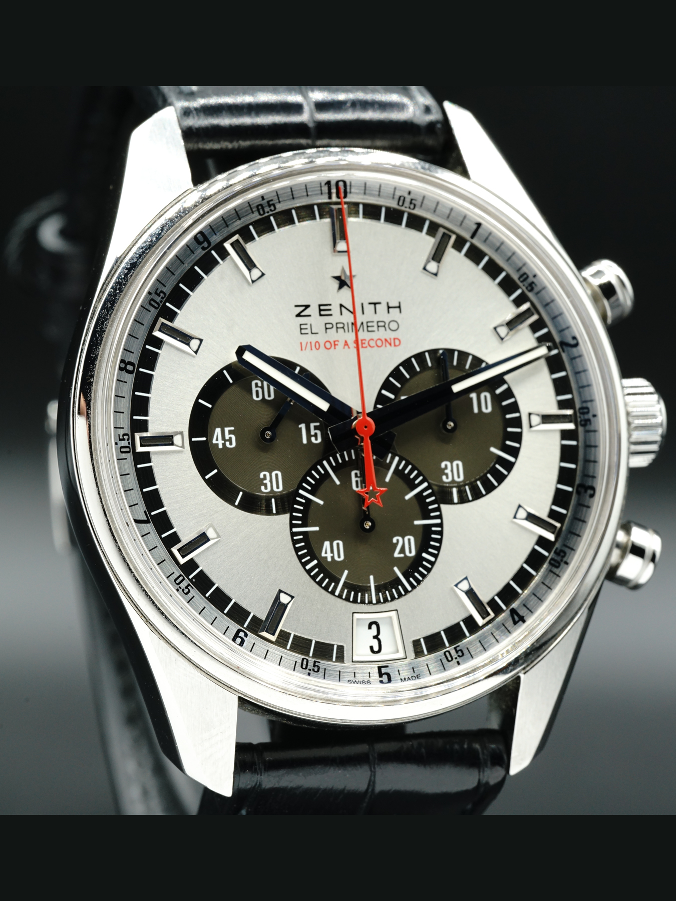 This Zenith El Primero Striking 10th Chronograph is in EXCELLENT condition. This watch features a polished stainless steel case. Silver dial with contrasting outer black seconds indicator rim. Anthracite sub-dials with fine circular guilloche texture. This watch includes its original box, papers, and international warranty card dated for August 2013. This is a limited edition piece.