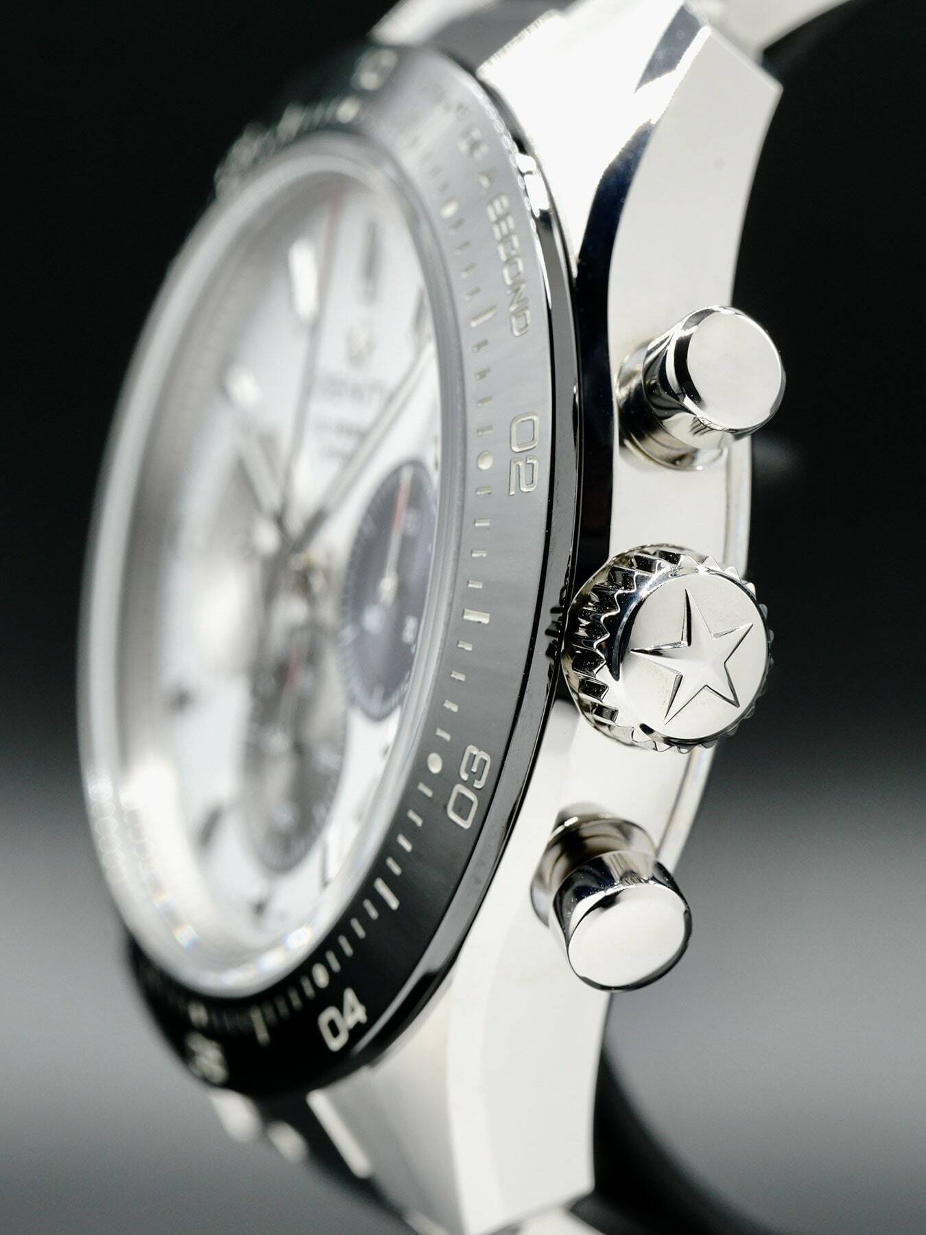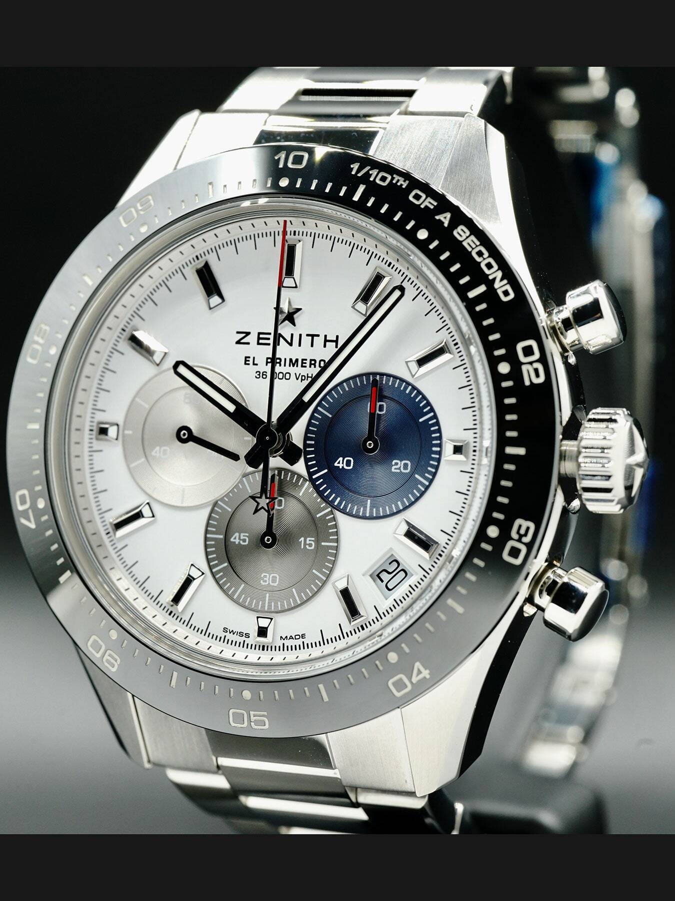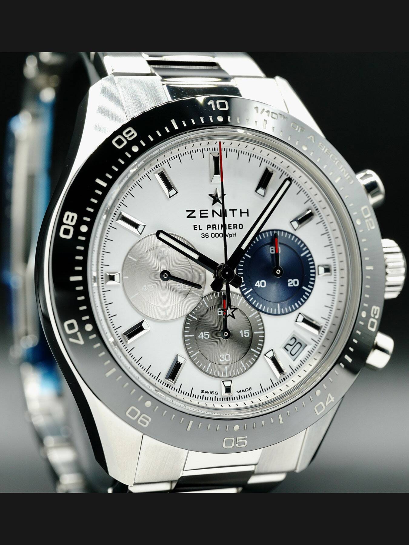This Zenith Chronomaster Sport features a 41mm stainless steel case with a black ceramic bezel and a transparent sapphire crystal case back on an integrated stainless steel bracelet. This watch also sports a white dial with three-different colored sub-dials and luminous hands covered by scratch resistant sapphire crystal.