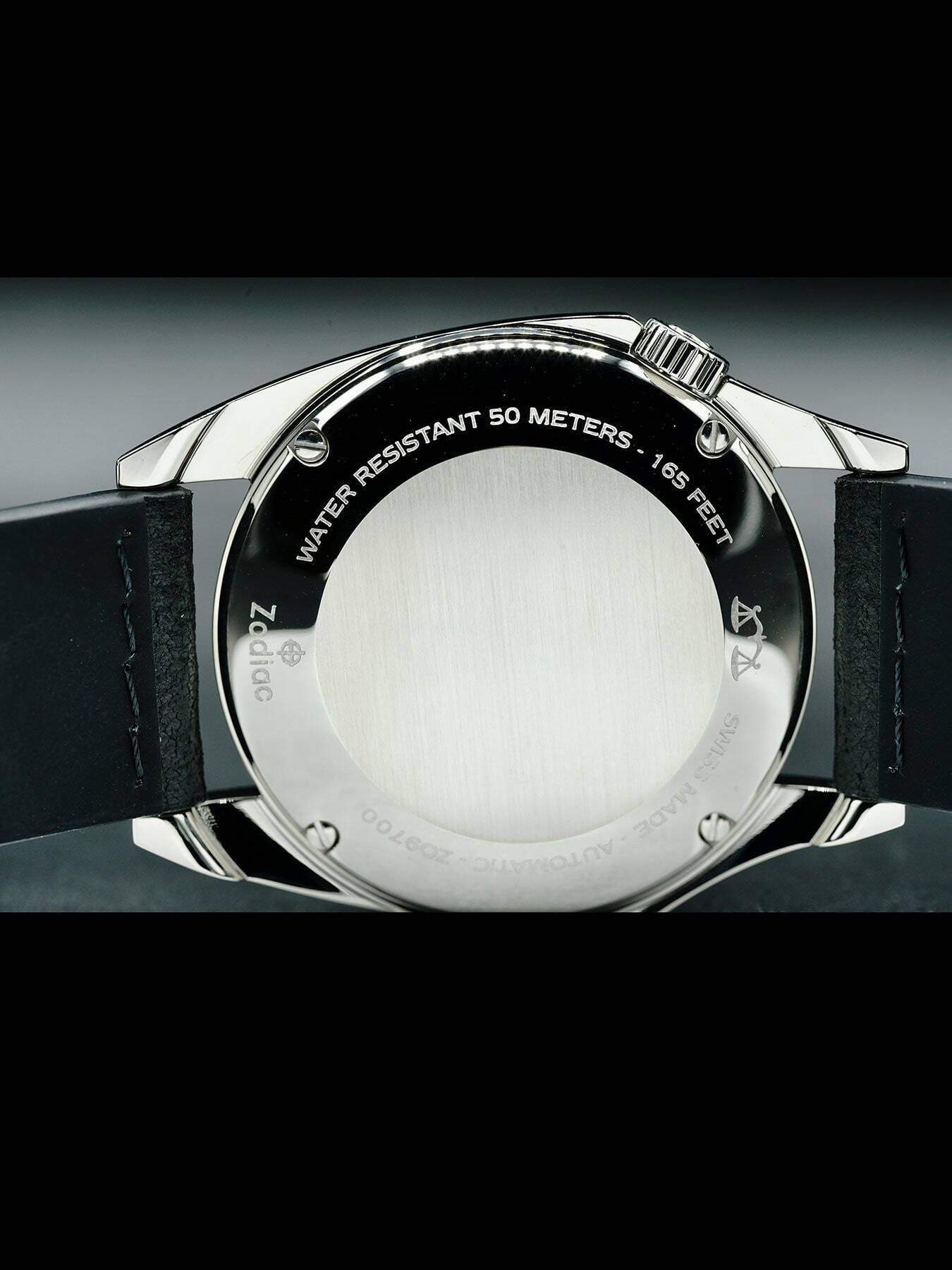 This Zodiac Olympos features a 37.5mm manta ray-shaped stainless steel case with a solid case back on a black leather strap. This watch also sports a black dial with silver-toned hands, index dial markers, and date display covered by domed sapphire crystal.