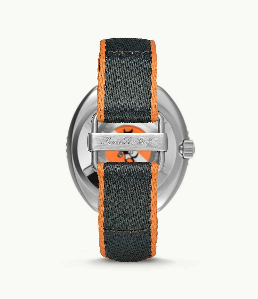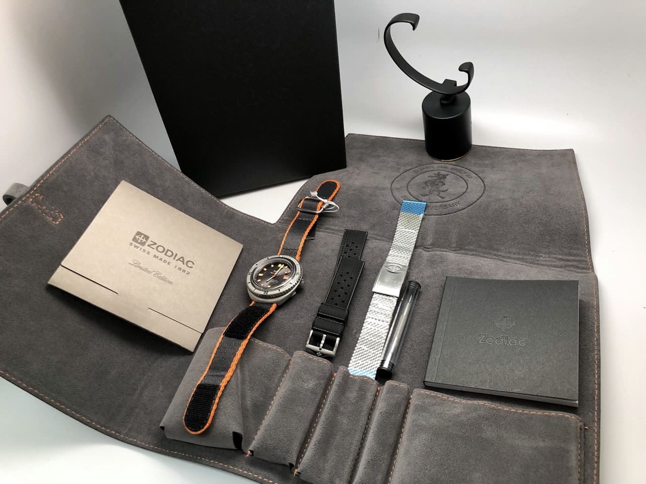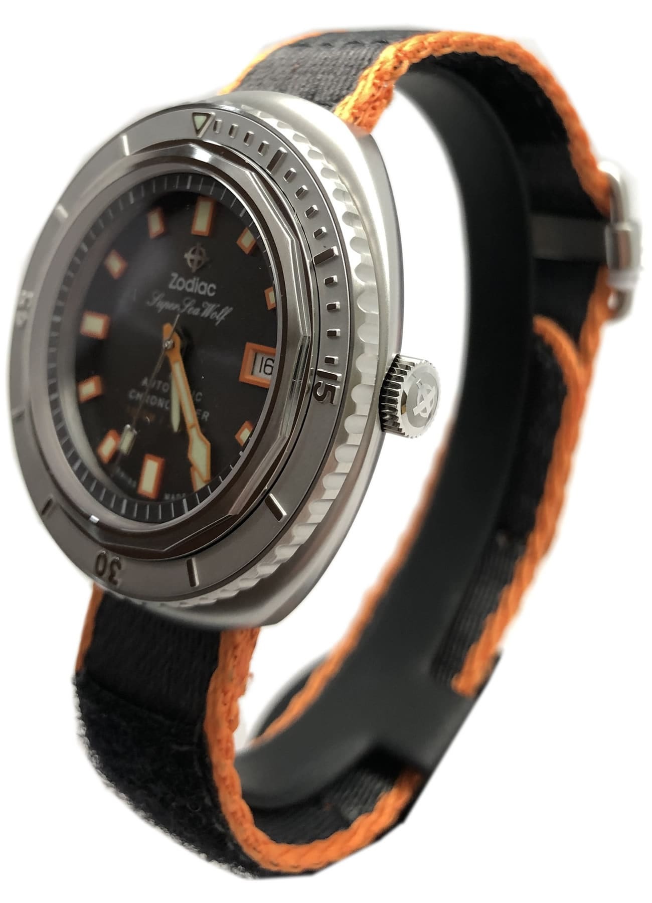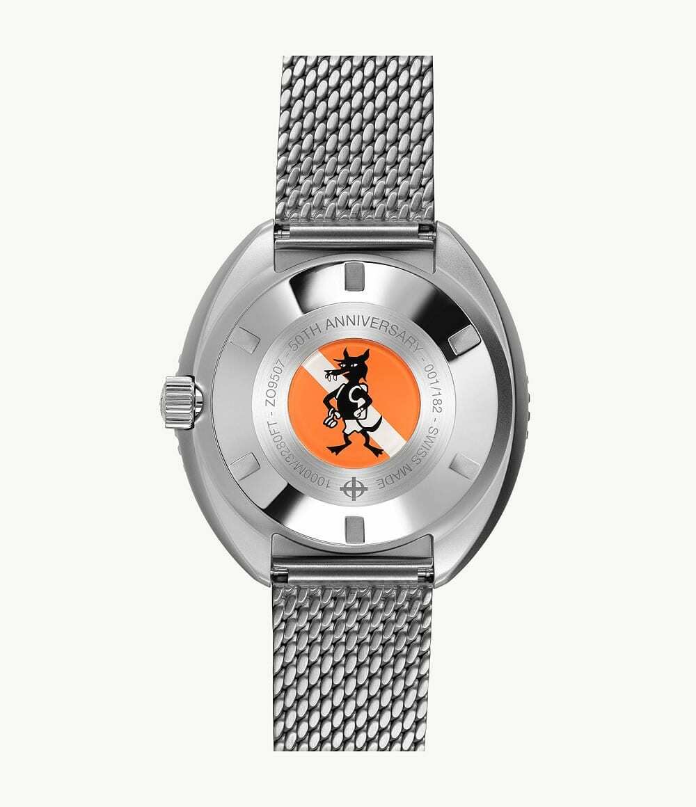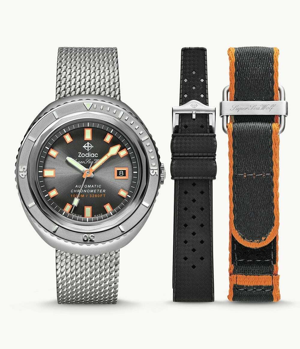 This limited edition timpiece marks the 50th anniversary of the original Super Sea Wolf, a landmark watch for Zodiac. The caseback displays the iconic Sea wolf character that was once used on advertising material during the original launch. It has a COSC-certified STP 3-13 movement contained in a stainless steel case with a newly designed locking topring, and comes specially packaged in a leather roll with a textile strap, “tropic” style rubber strap, an adjustable mesh band and a strap-changing tool.