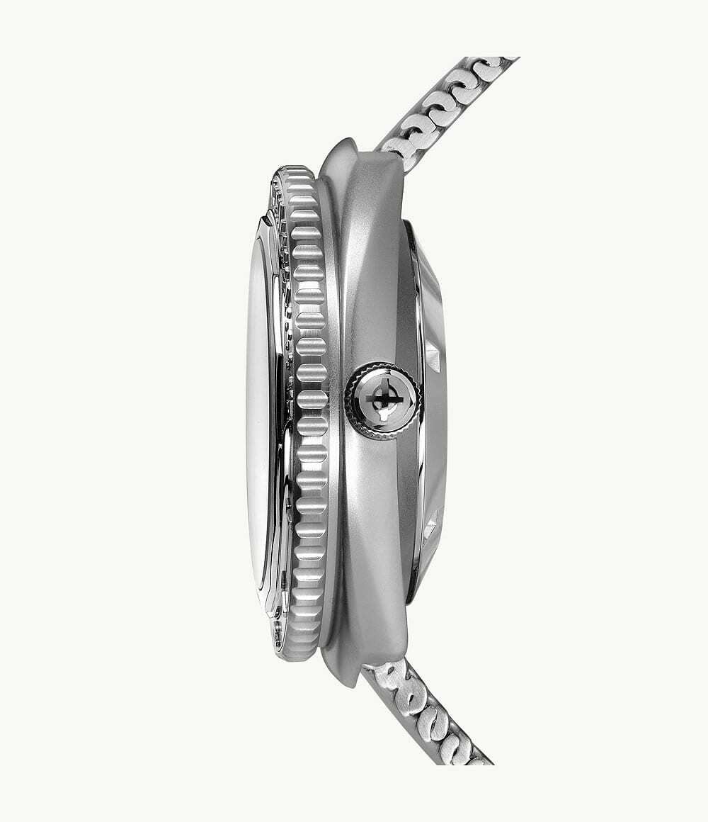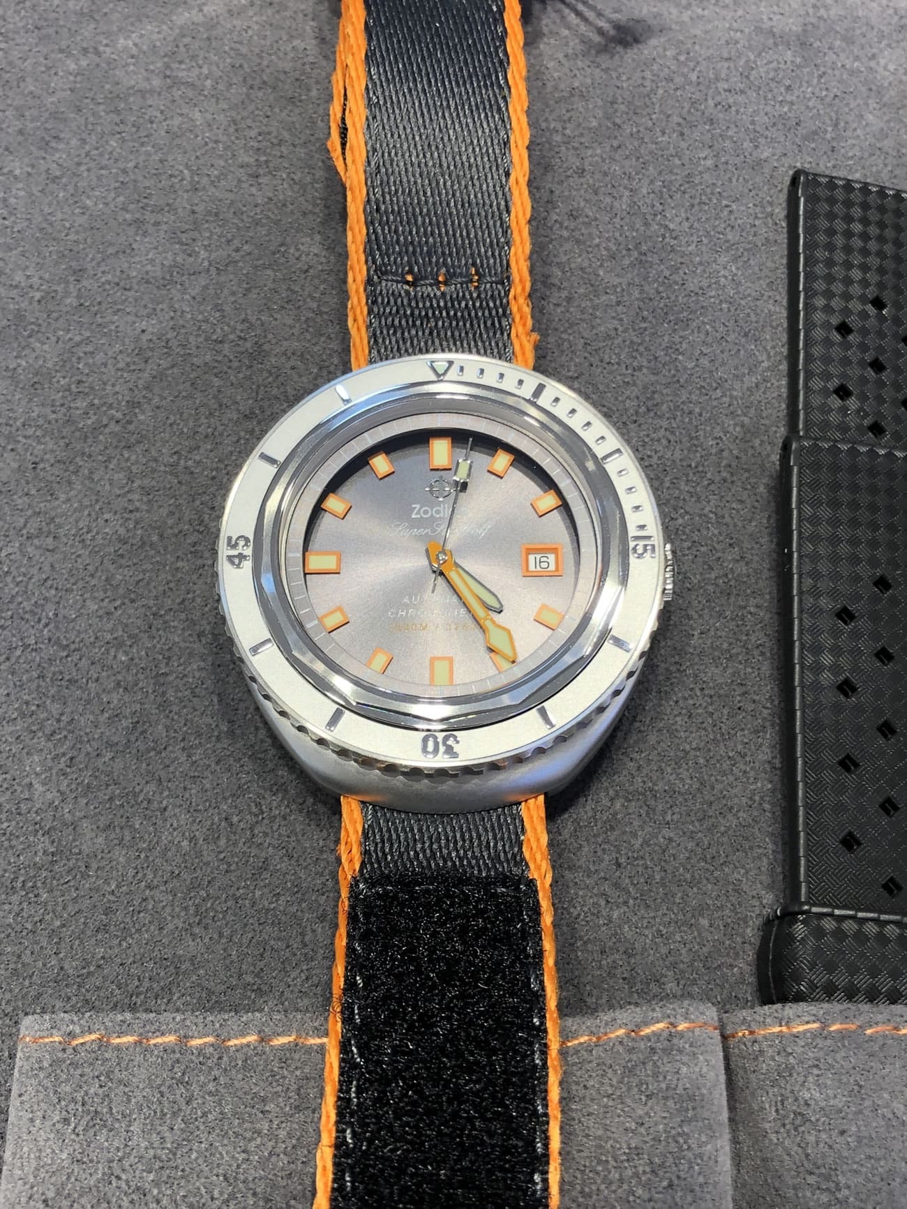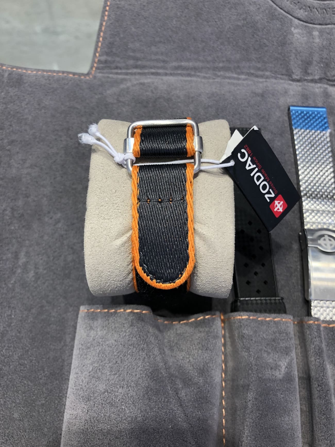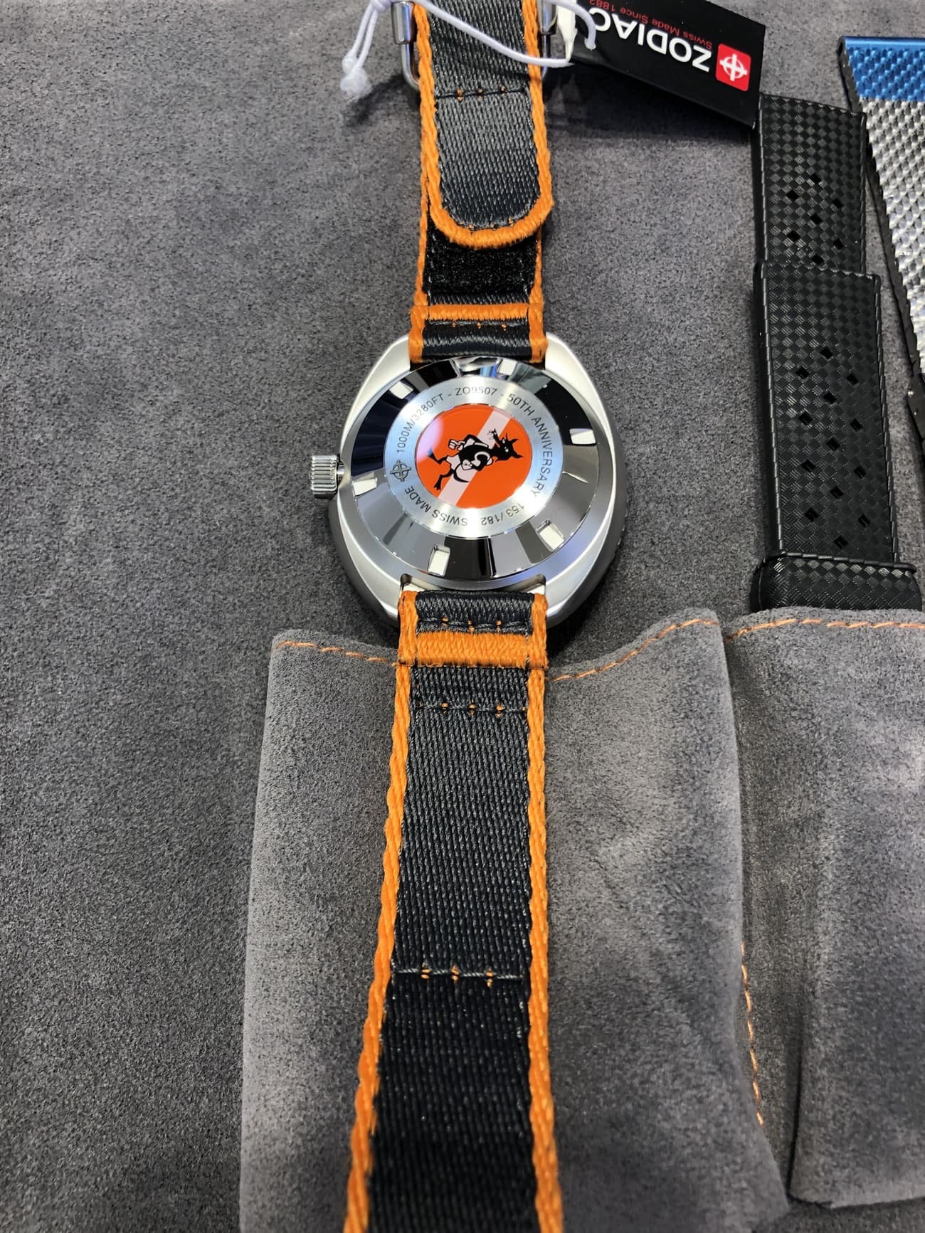 This limited edition timpiece marks the 50th anniversary of the original Super Sea Wolf, a landmark watch for Zodiac. The caseback displays the iconic Sea wolf character that was once used on advertising material during the original launch. It has a COSC-certified STP 3-13 movement contained in a stainless steel case with a newly designed locking topring, and comes specially packaged in a leather roll with a textile strap, “tropic” style rubber strap, an adjustable mesh band and a strap-changing tool.
