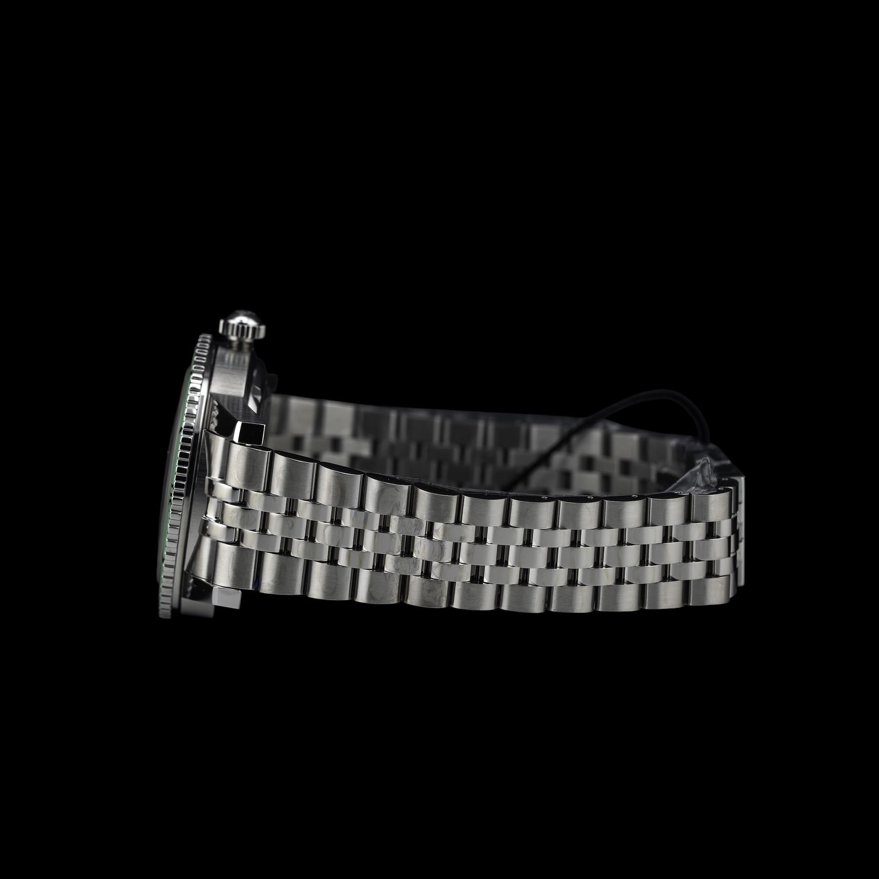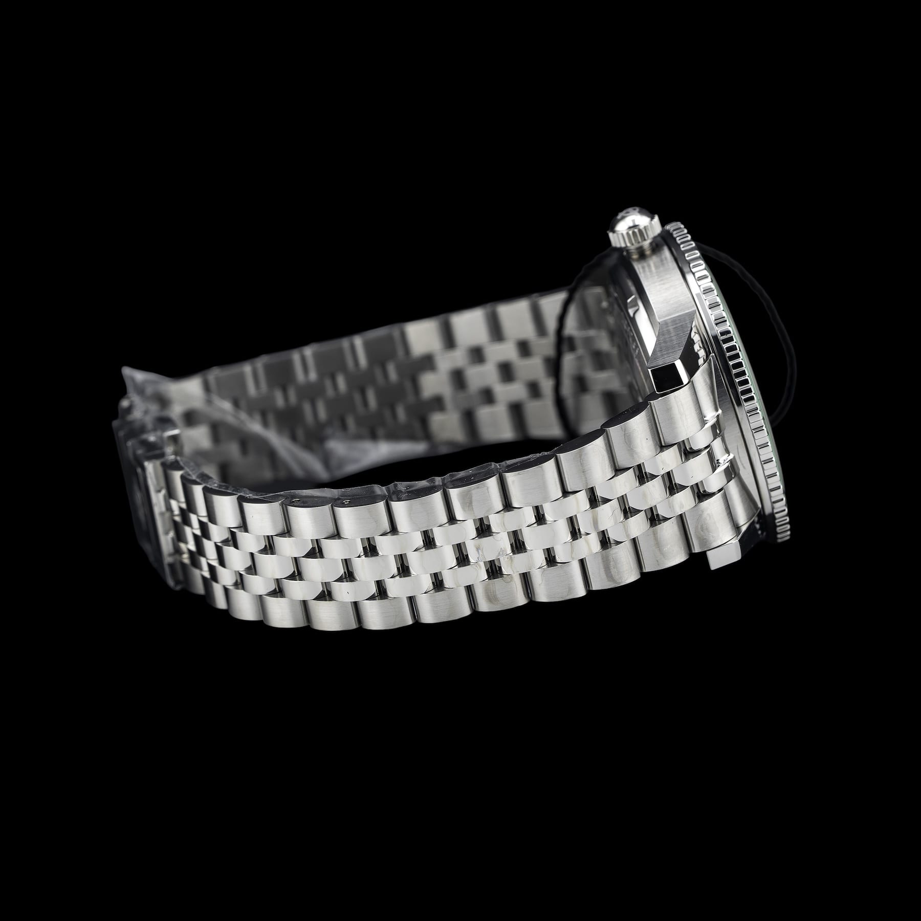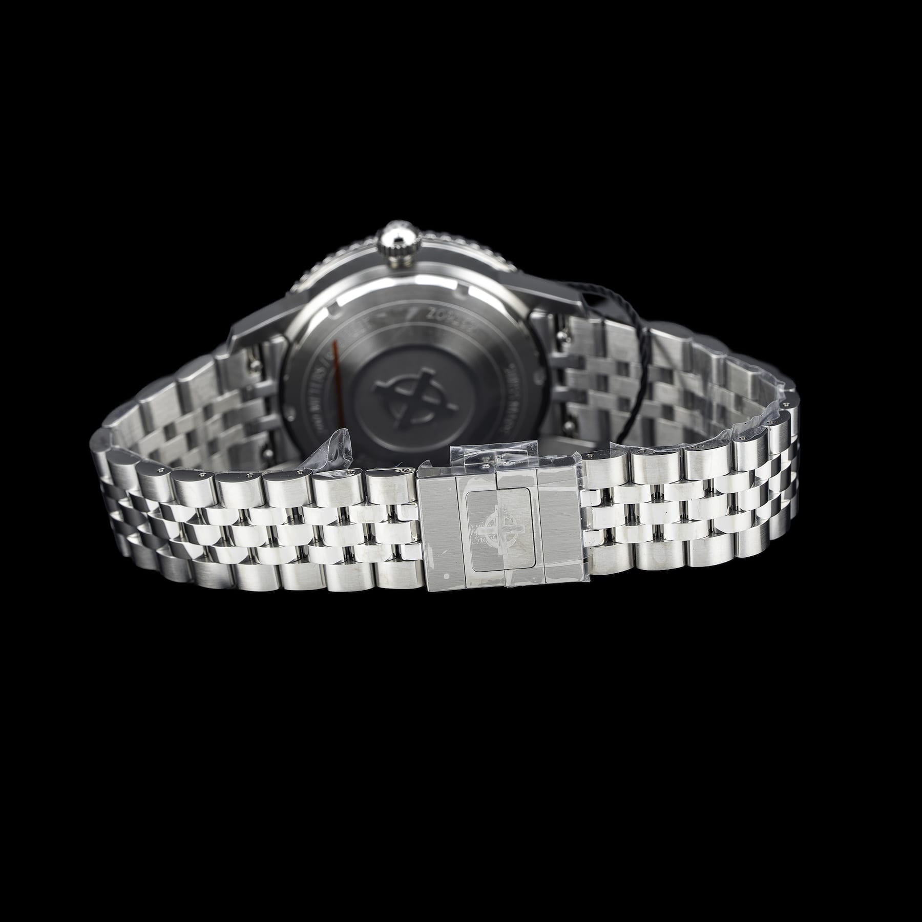 This watch features a 40mm stainless steel case on stainless steel bracelet. This watch also sports a silver dial. Powered by a mechanical automatic movement. Water resistance up to 200 meters.