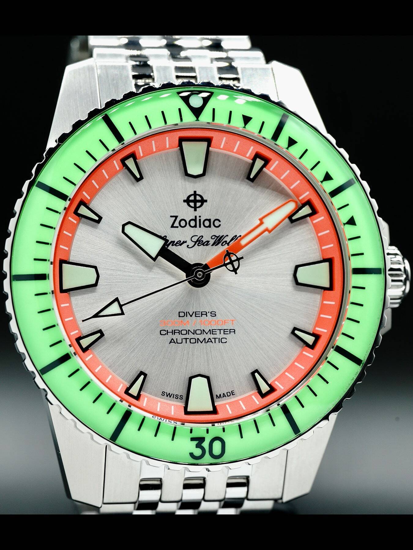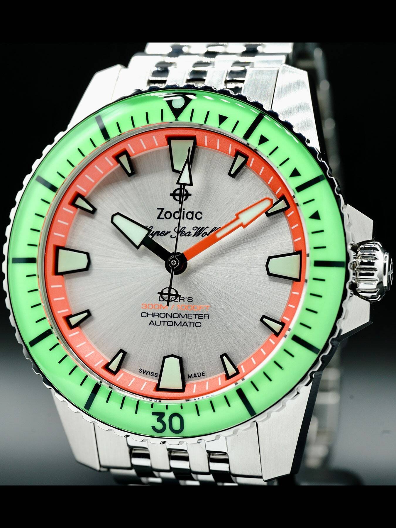 This Zodiac Super Sea Wolf Pro-Diver features a 42mm stainless steel case with a ceramic, luminous bezel insert on a stainless steel bracelet. This watch also sports a silver dial with luminous hands and index dial markers covered by scratch resistant sapphire crystal.