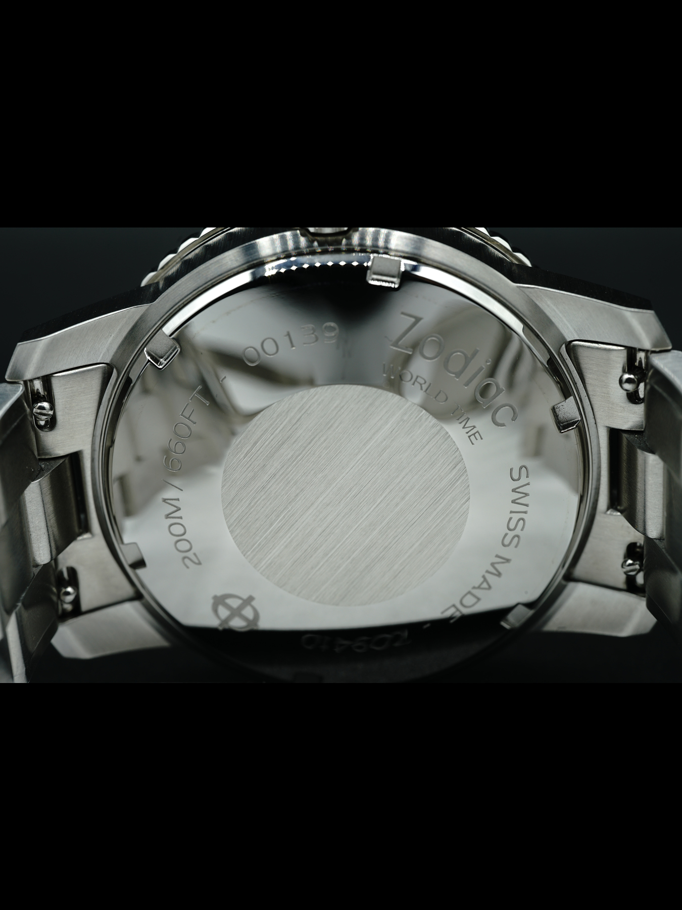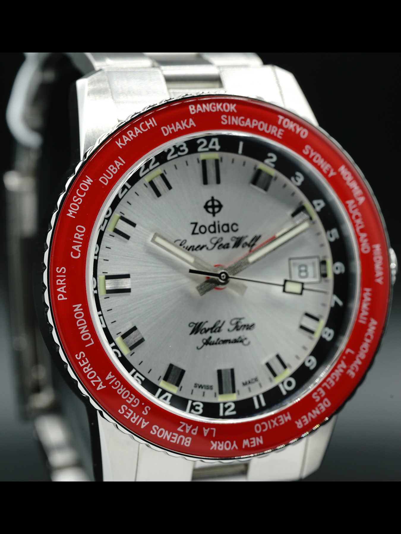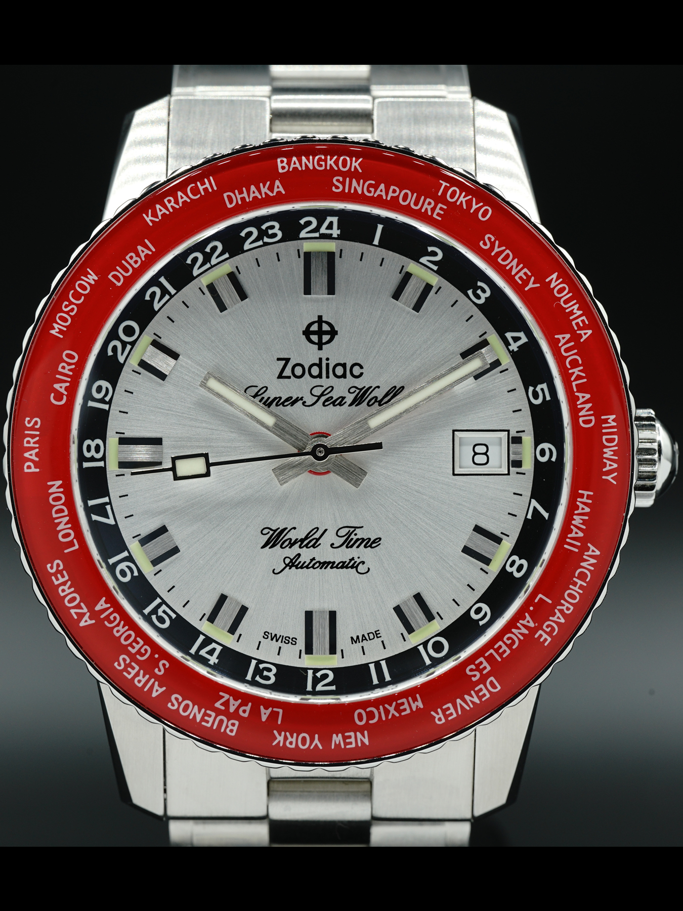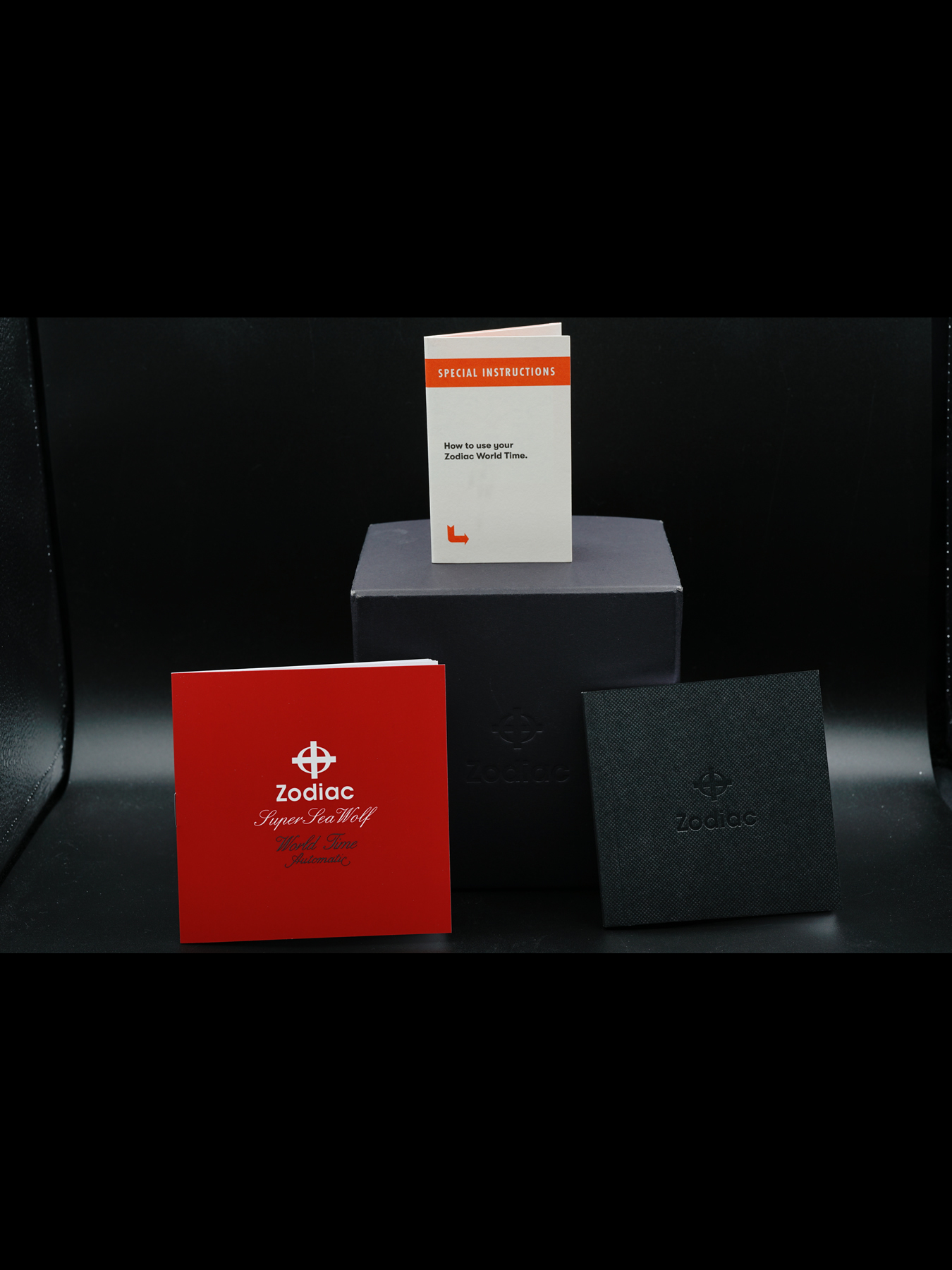 This Zodiac World Time is in LIKE NEW condition. This watch includes its original box, papers, and warranty.