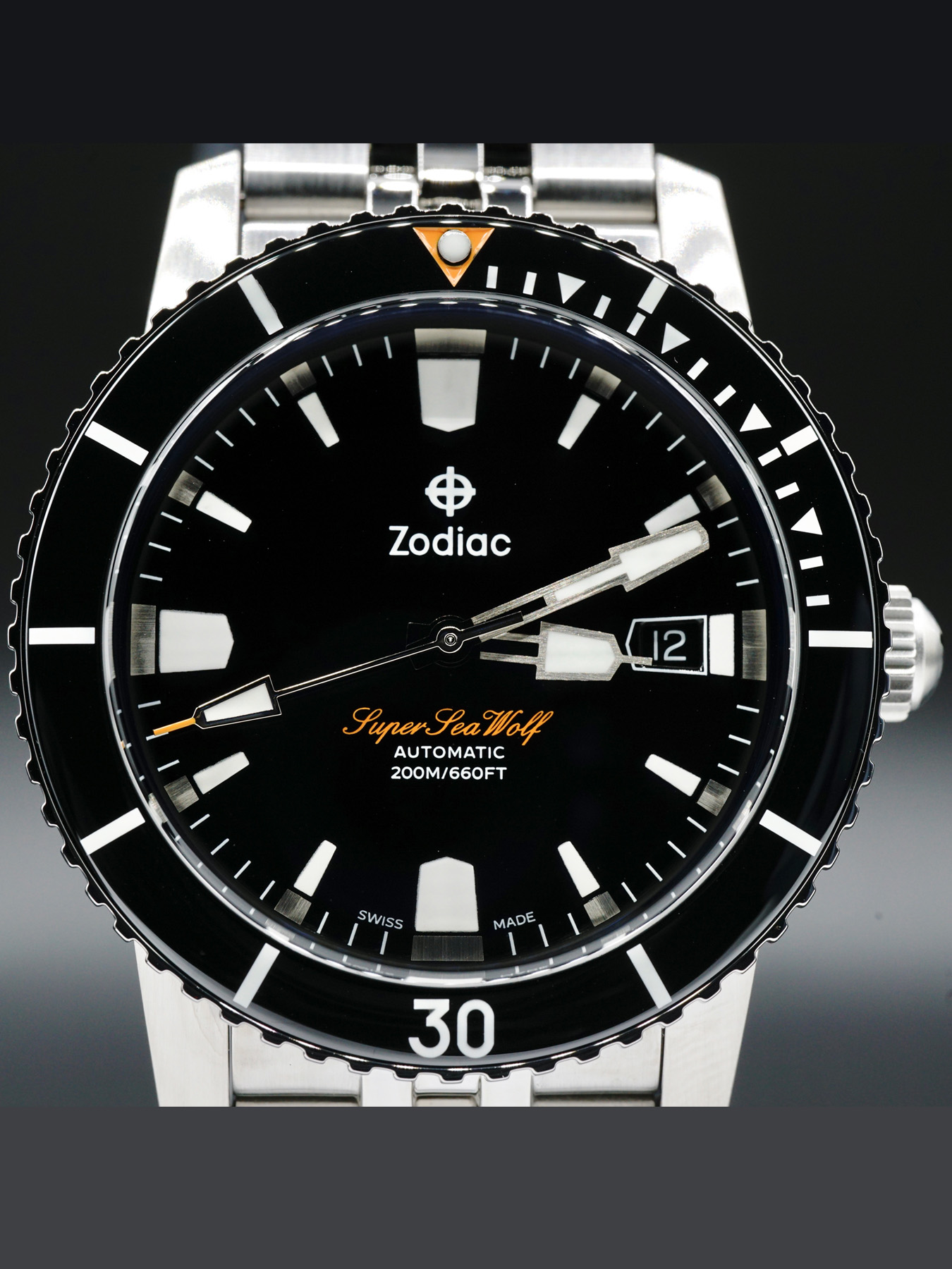This Zodiac ZO9288 Super Sea Wolf 53 Compression is in GREAT condition. This watch includes its Original Box, Original Papers and Warranty Dated 12/25/2022. Extra bracelet links. This watch has been fully authenticated and certified by Exquisite Timepieces.