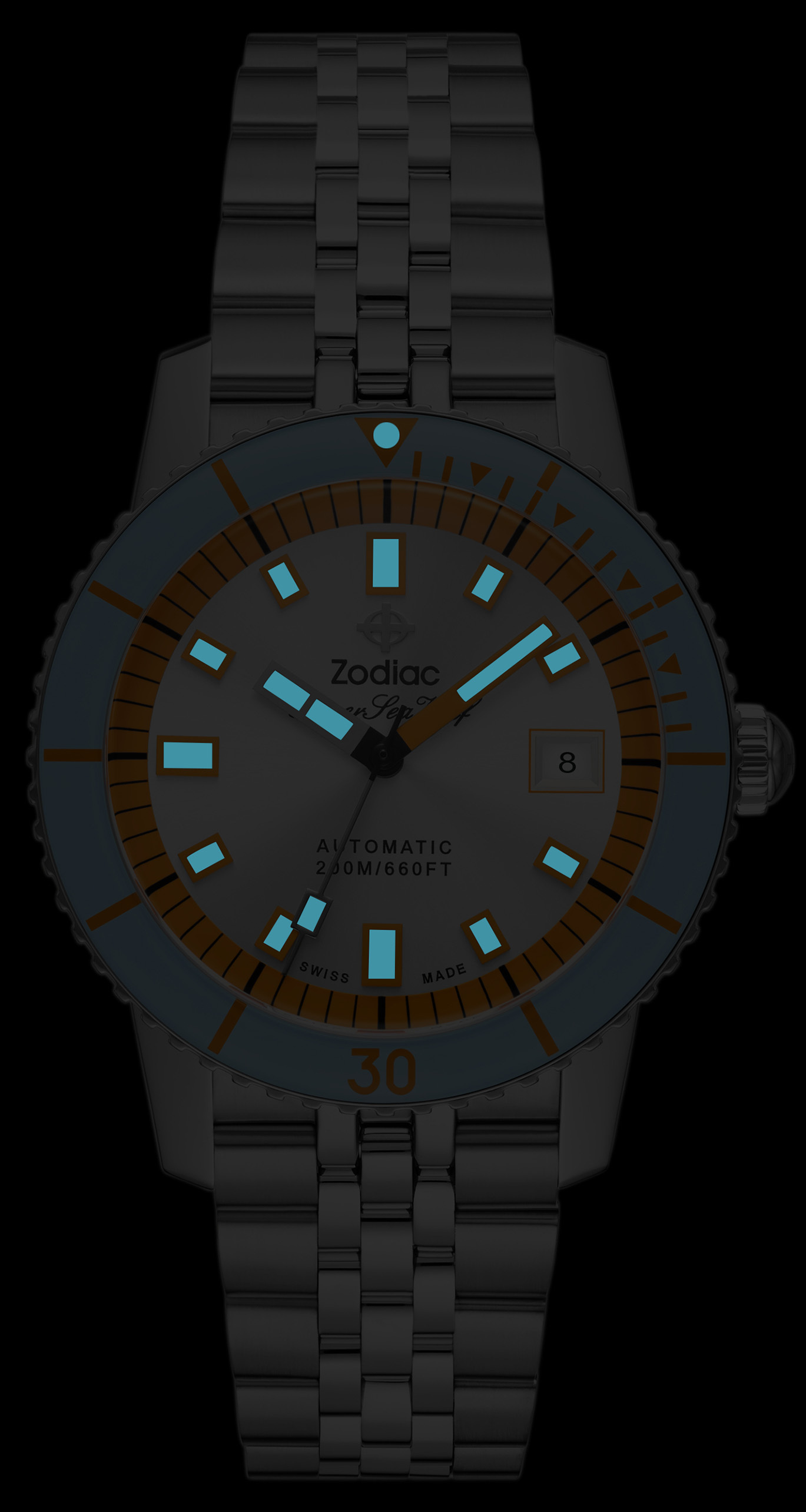 This 40mm Super Sea Wolf Compression features a stainless steel case, silver sunray dial, STP 1-11 Swiss automatic movement, a 44 hr power reserve, Super-LumiNova, a 5-link stainless steel bracelet and is water resistant to 200 meters.