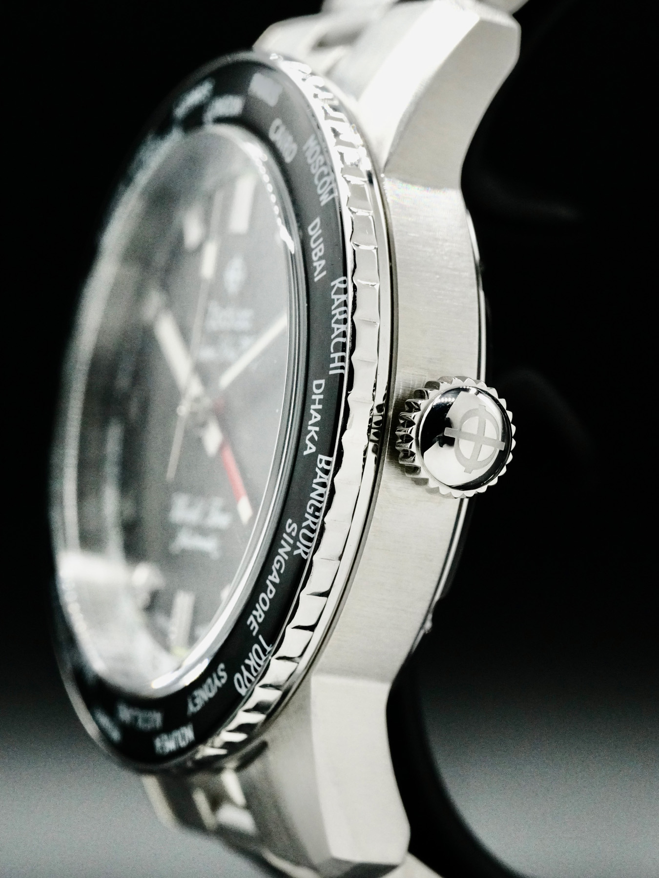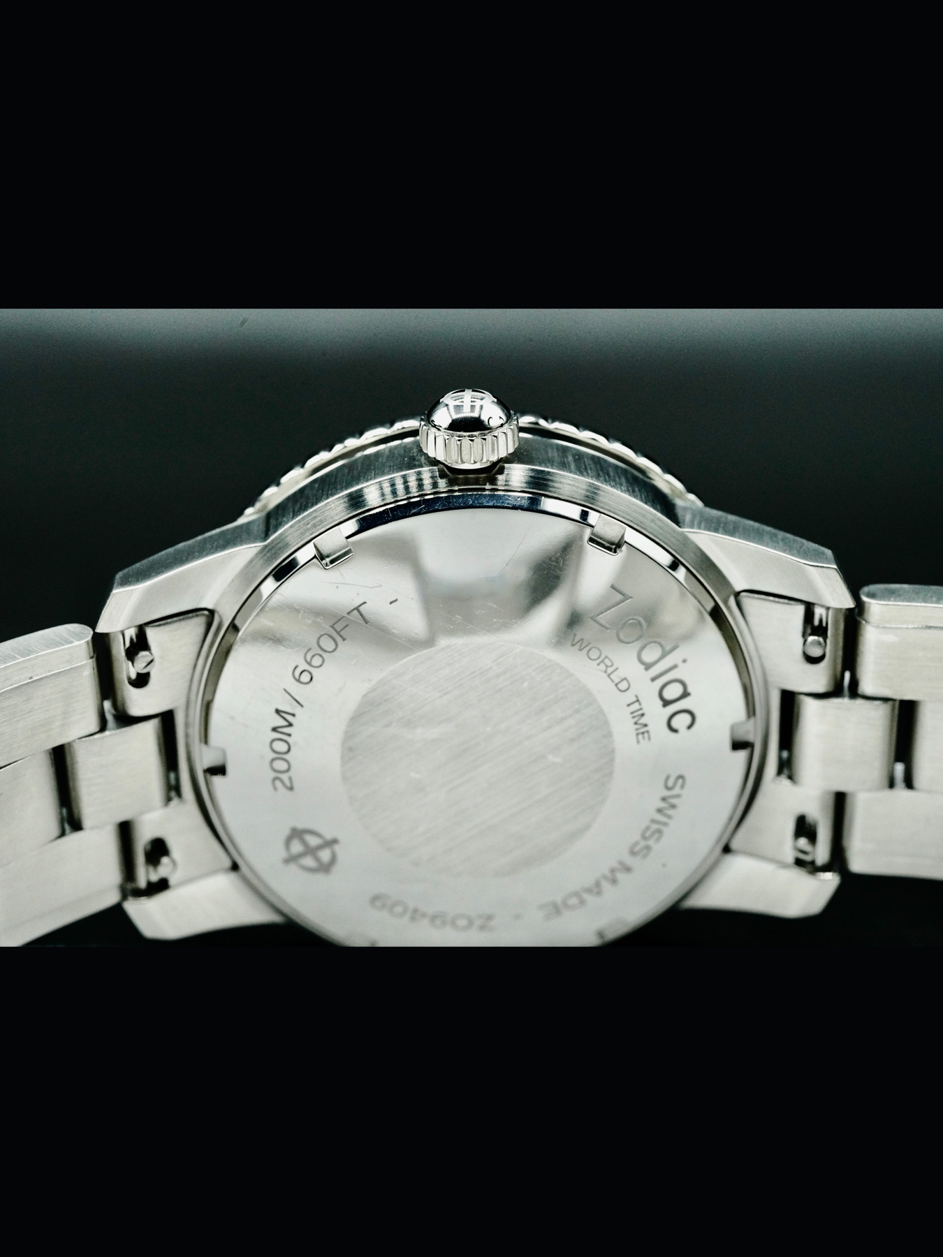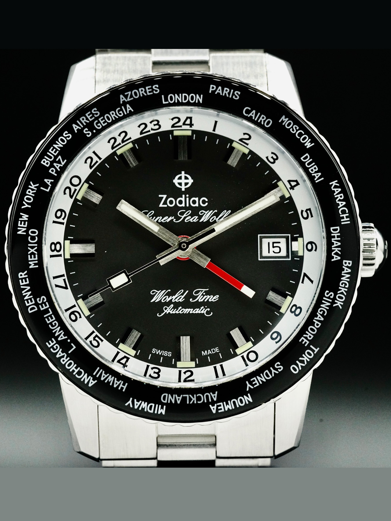 This Zodiac ZO9409 Super Sea Wolf World Time GMT Black is in GREAT condition. This watch includes its Original Box, Warranty Card Not Dated and Bracelet Links Missing and Fits 7 1/4 Inch Wrist. This watch has been fully authenticated and certified by Exquisite Timepieces.