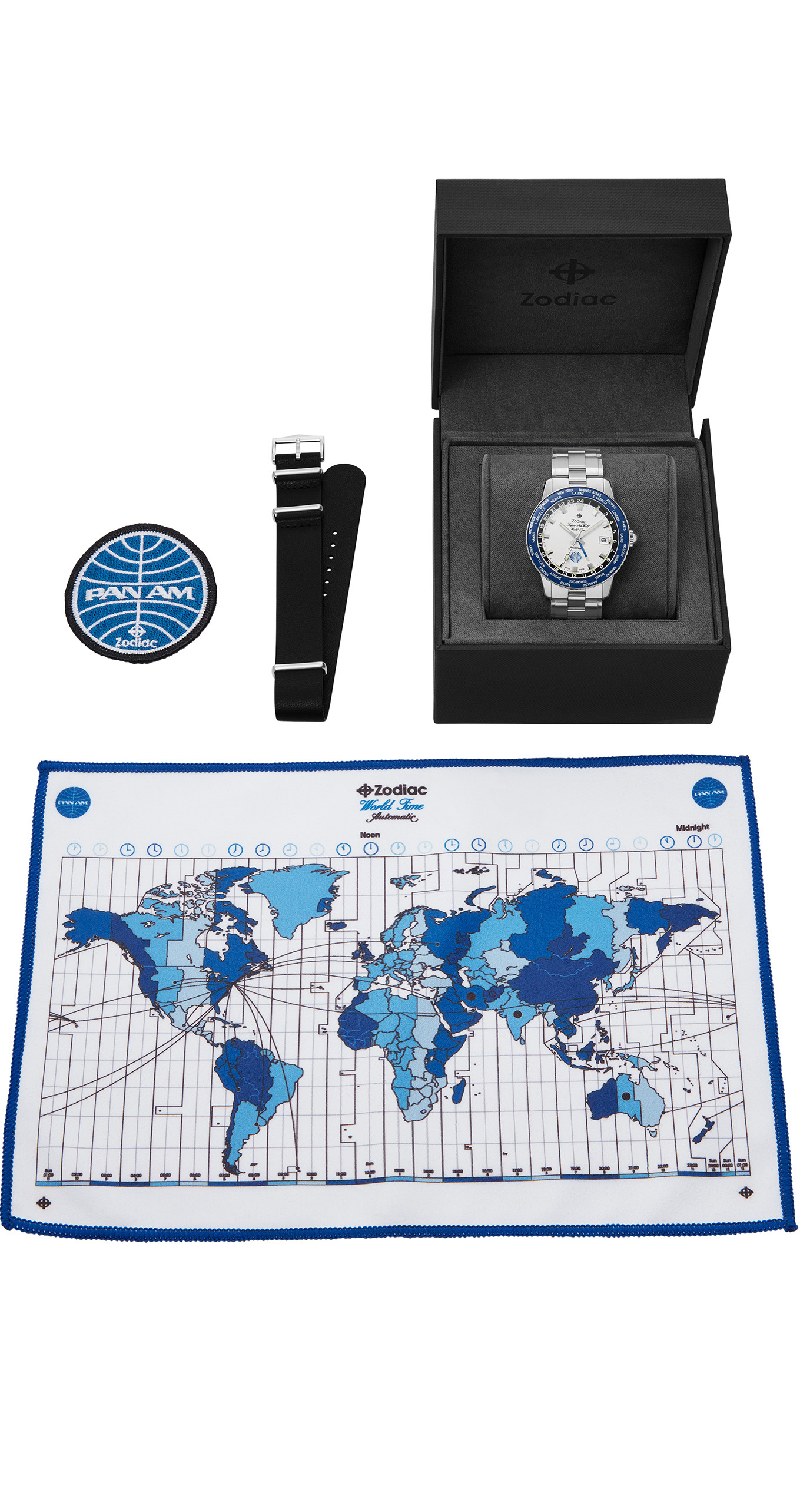 Discover the Zodiac ZO9412 Super Sea Wolf 'Pan Am' World Time, a limited edition stainless steel watch that pays tribute to the iconic Pan Am airline of the Jet Age. Featuring a white dial with a Pan Am motif, luminous hands and markers, and a sapphire crystal, this 40mm timepiece offers functions including hours, minutes, seconds, date, and GMT. Powered by a mechanical automatic movement (Caliber C125), it ensures precision and reliability. With a water resistance of 200m and a stainless steel bracelet strap with a deployant clasp, this men's watch is both stylish and durable. Enjoy a 2-year warranty with this exceptional Zodiac timepiece.