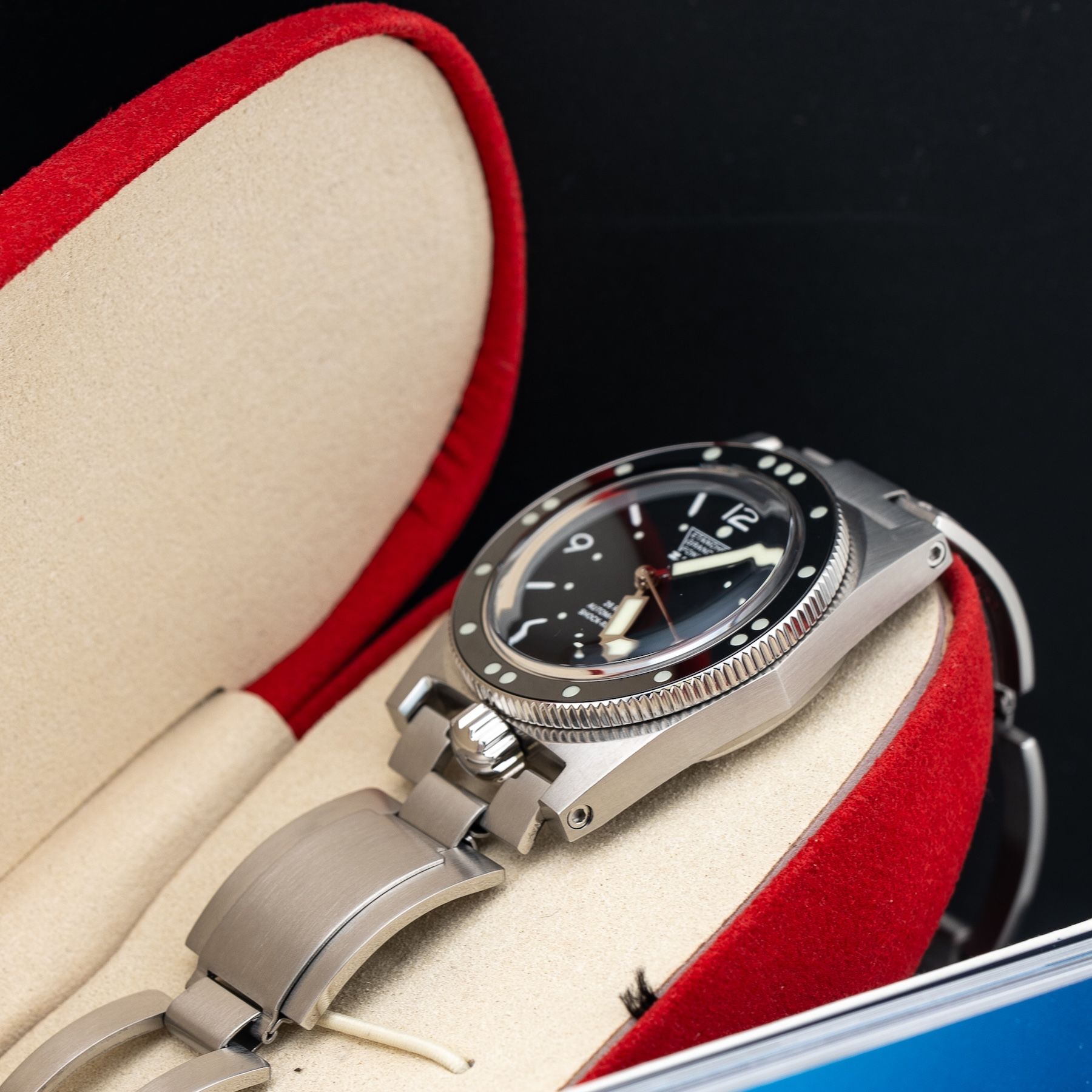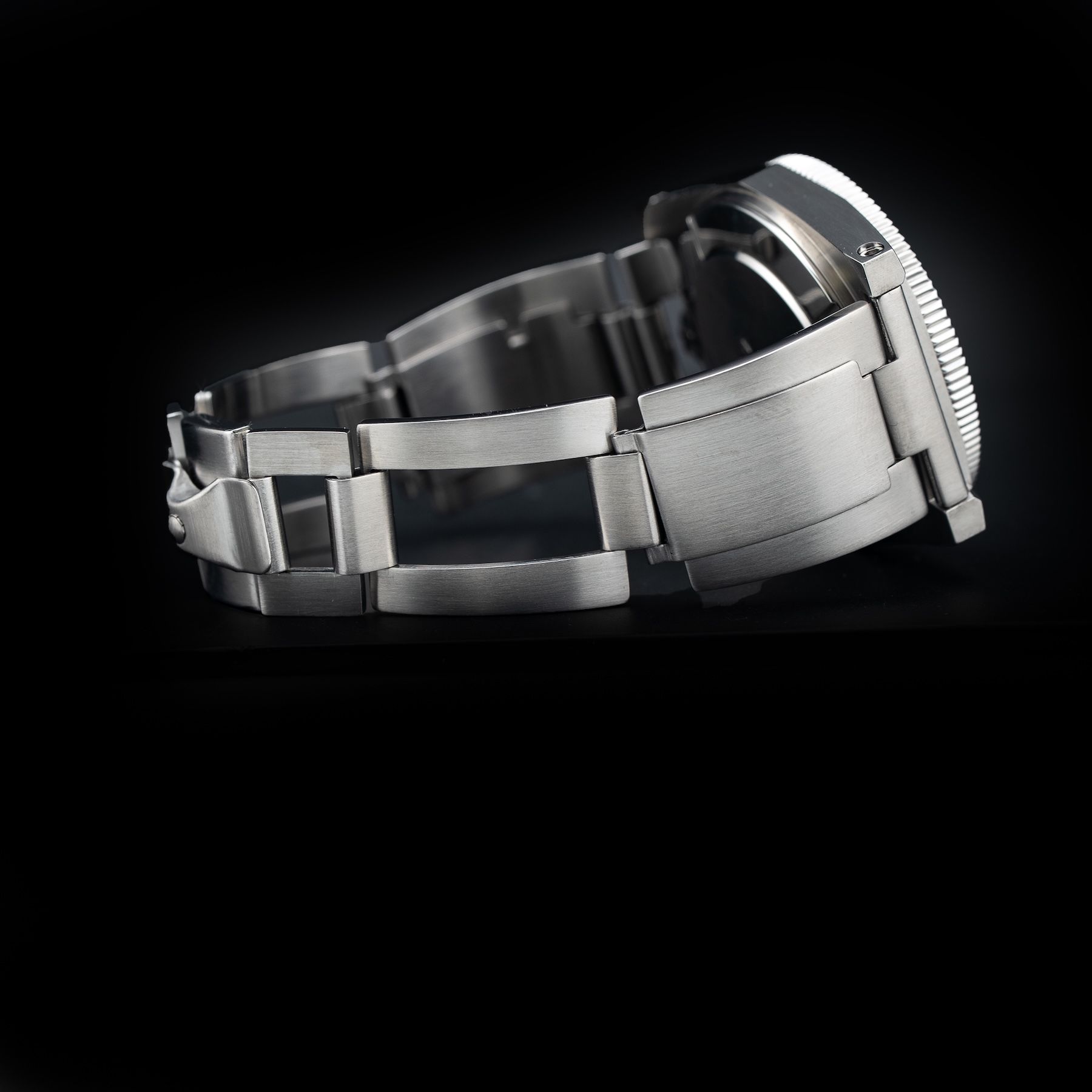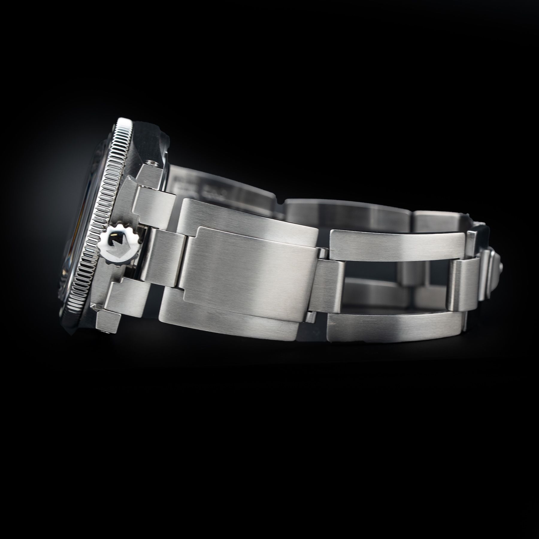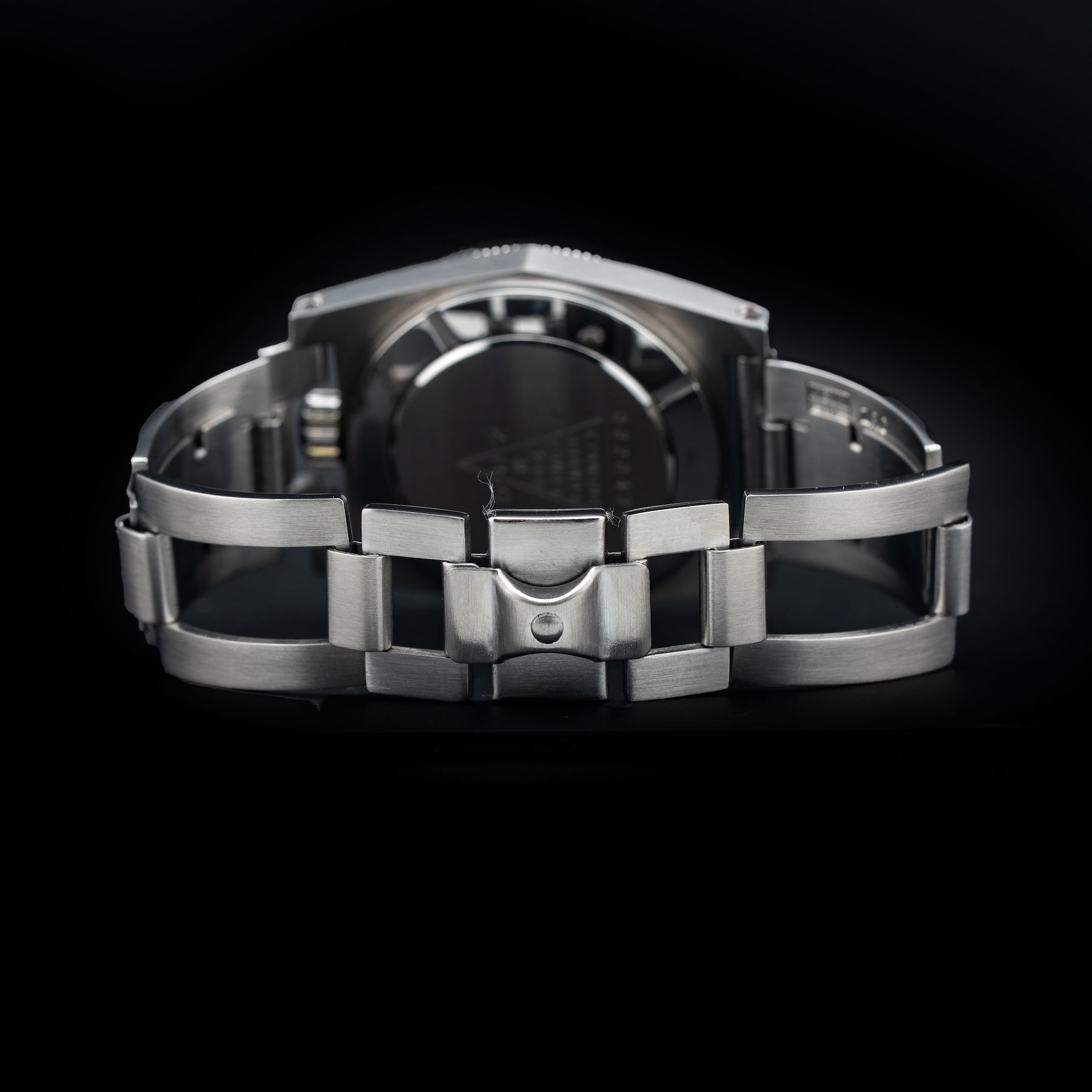 This watch features a 39mm stainless steel case on stainless steel bracelet. This watch also sports a black dial. Powered by a mechanical automatic movement. Water resistance up to 300 meters.