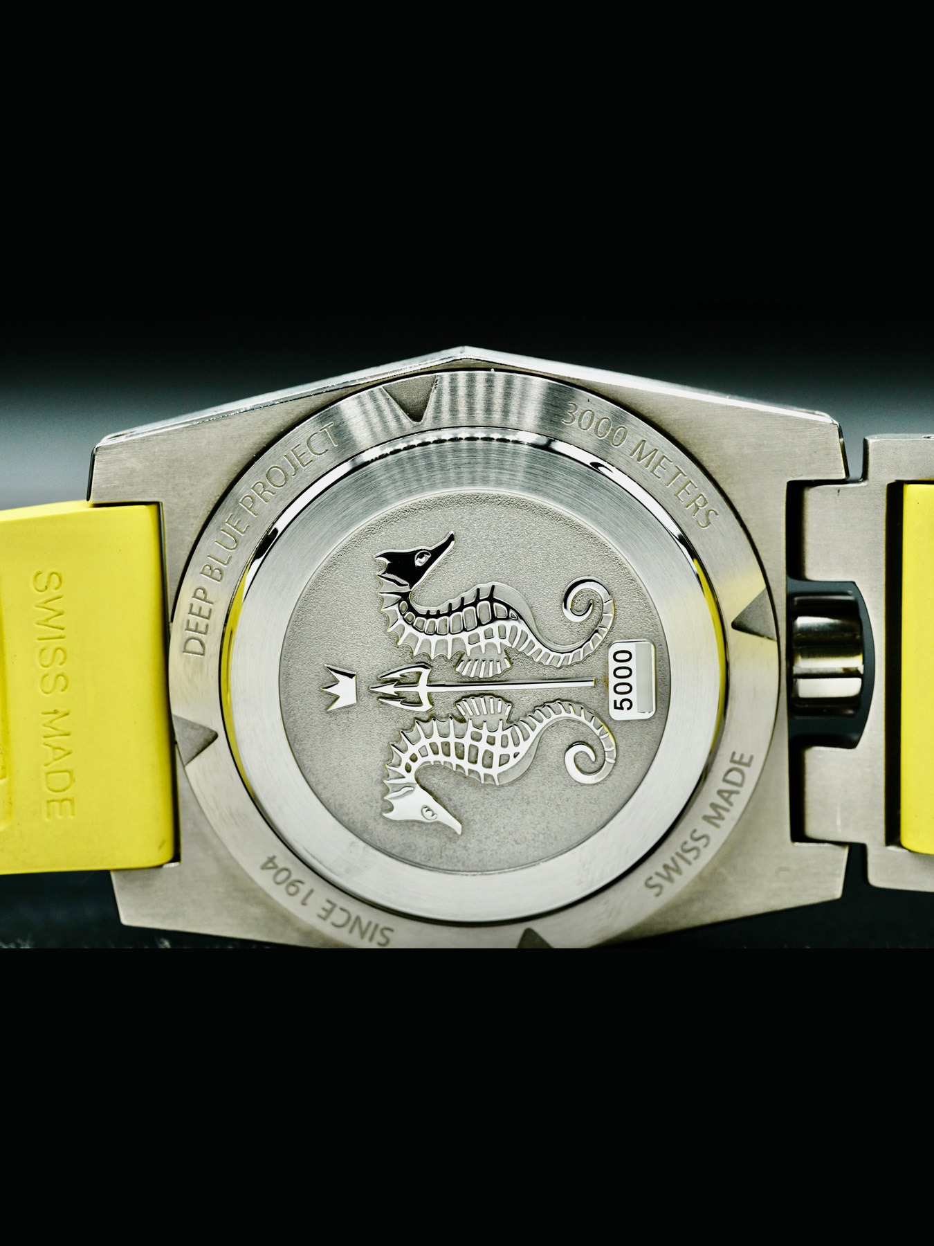 This watch features a 42mm titanium case with blue dial. Powered by a Mechanical Automatic Movement. Water resistance up to 3000 meters.