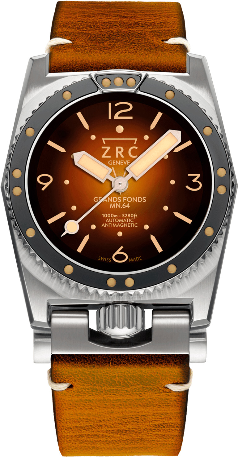 The ZRC Grands Fonds combines comfort and traditional aesthetics with uncompromising technical reliability. Contemporary face of the original Grands Fonds 300®, this Vintage version with its tropicalized dial and equipped with a leather strap bears all the advantages of a diving watch.